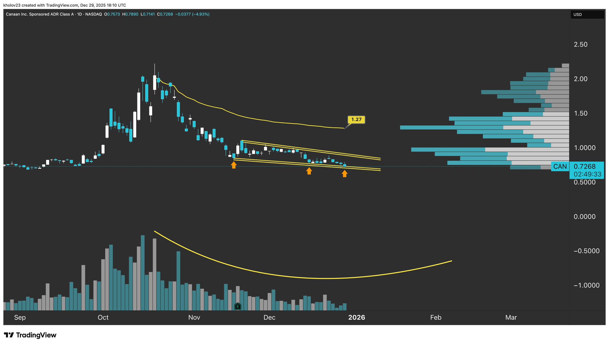 The chart read is incomplete. $CAN isn’t in a “full bearish alignment” — it’s in a low-volume accumulation range.