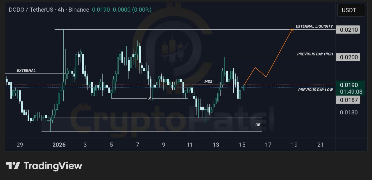 DODO 4-hour bullish setup, target price 0.0200-0.0210.