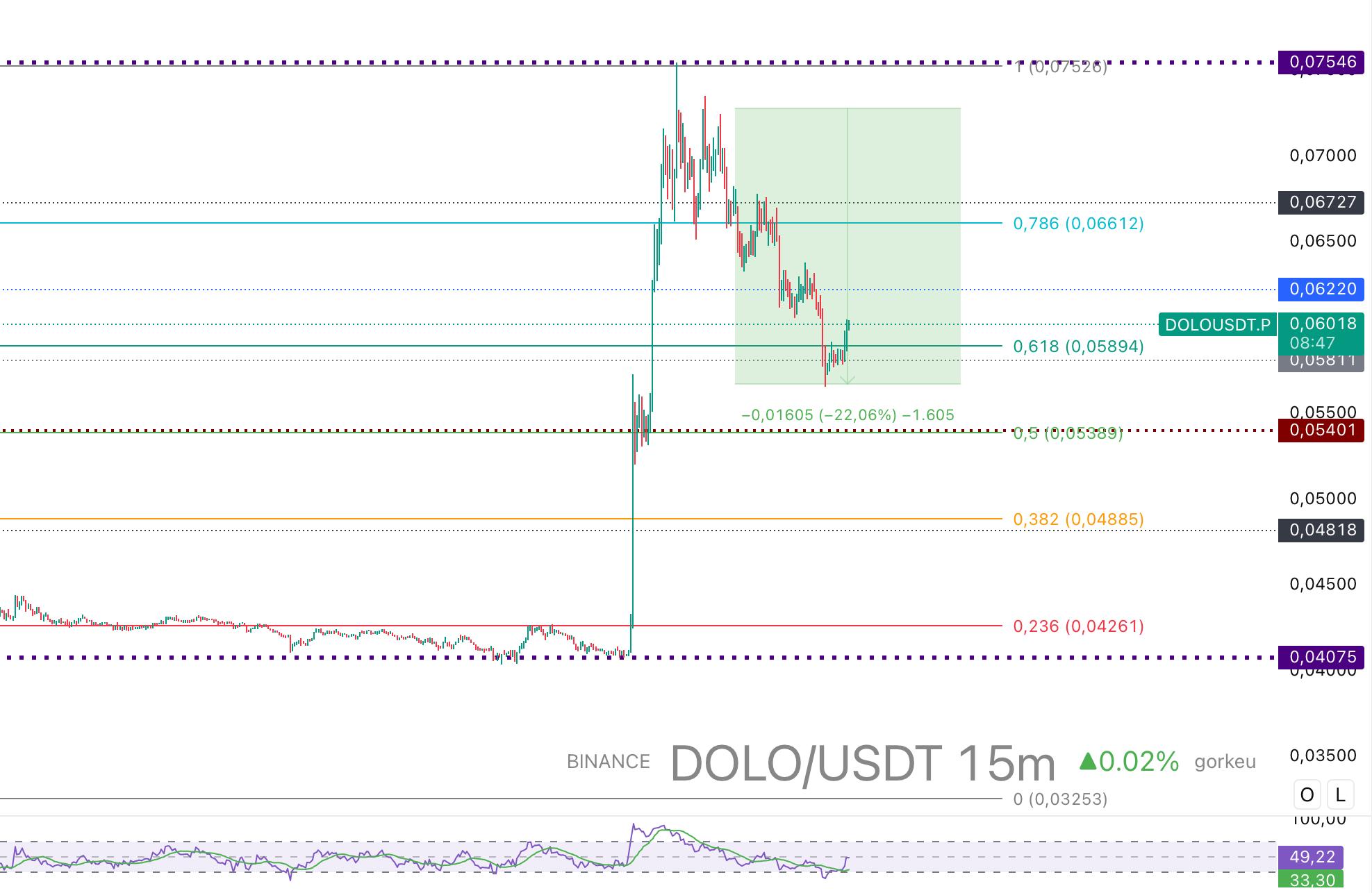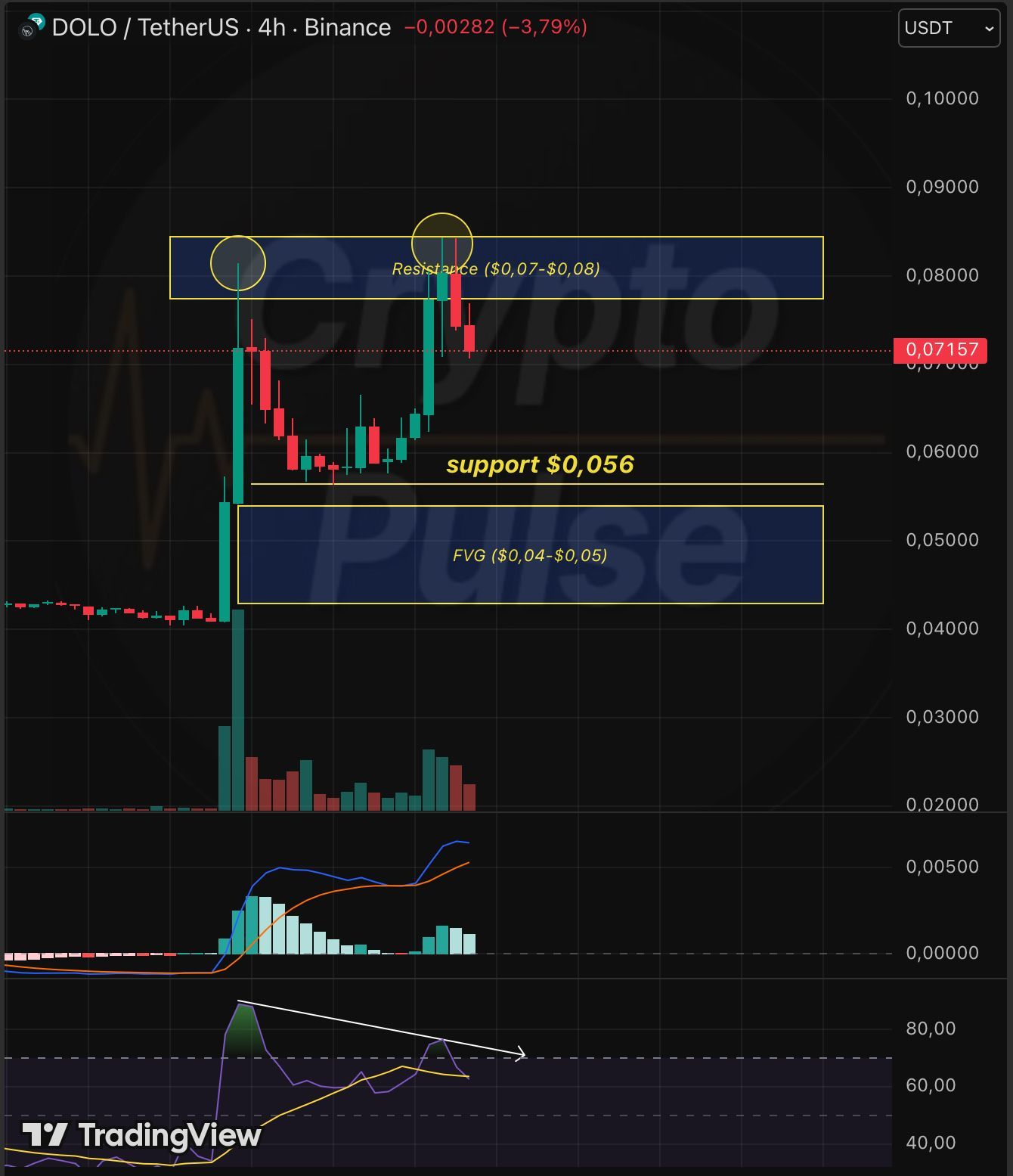 DOLO short-term bearish, blocked at $0.07-0.08, RSI divergence, may fall to $0.056.