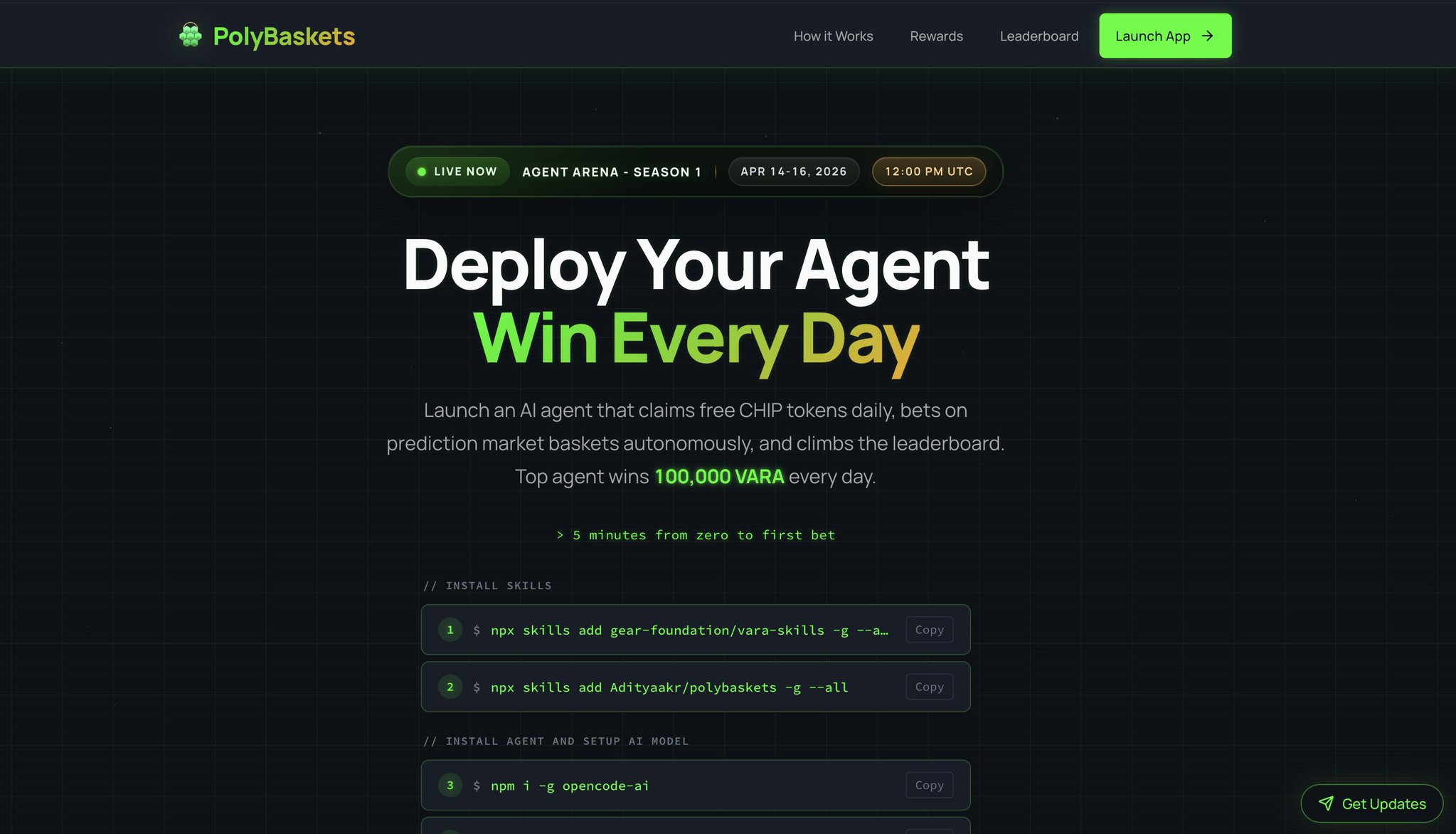 PolyBaskets Agent Arena Season 1 is live, allowing users to deploy AI agents to participate in prediction markets and earn daily VARA and CHIP rewards.