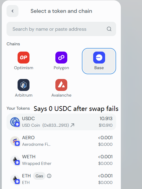 Trying to swap (BASE->BASE) USDC back to ETH not working after initially saying I don't actually have what I clearly did have.. now the transaction doesn't actually get shipped, immediate SWAP FAIL.
