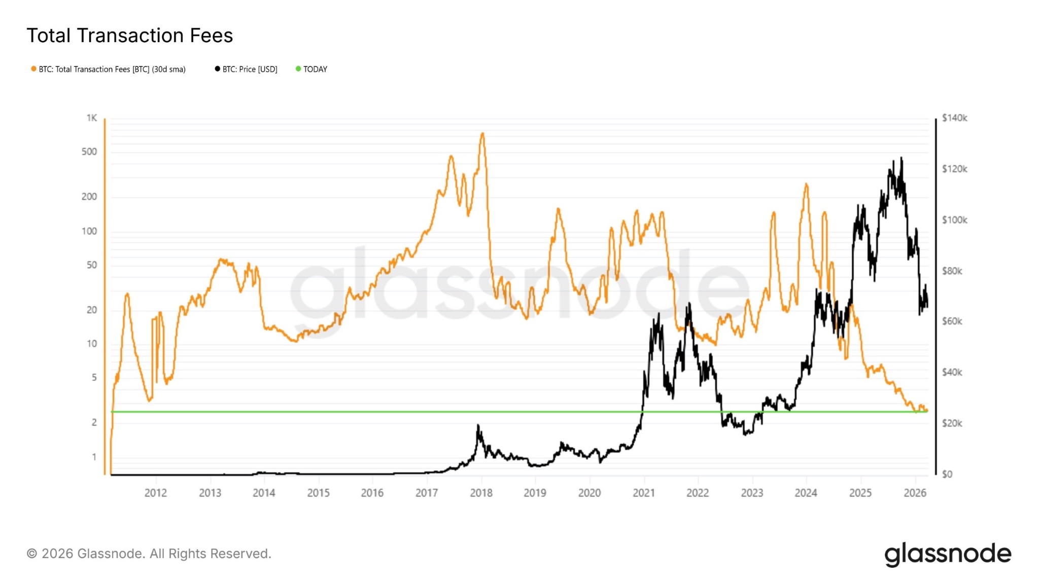 The 30D SMA of Bitcoin's total daily transaction fees has dropped to 2.5 $BTC per day.
