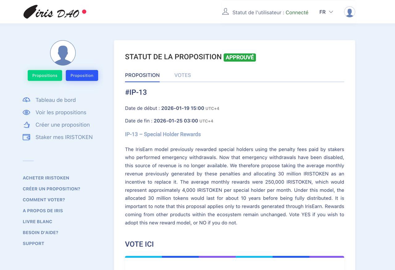 The Iris DAO community approved the IP-13 proposal, allocating 30,000,000 IRISTOKEN as a holder reward.