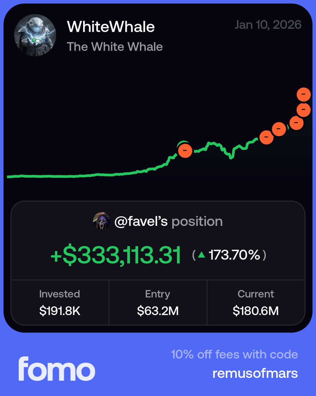 Trader @f4vel made huge profits by investing in FOMO, achieving a return of 173.70%.
