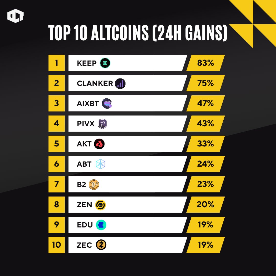 The tweet displays the top 10 altcoins with the highest gains in the past 24 hours, which can be used to monitor short-term market trends.