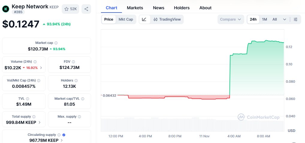 KEEP price surged 94% achieving a major breakout, currently trading at $0.1247.