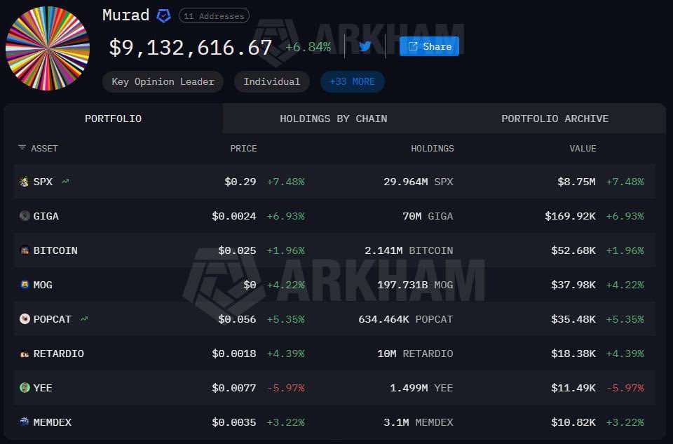 Meme coin KOL Murad’s portfolio plunged nearly 86%, losing $58 million over six months.