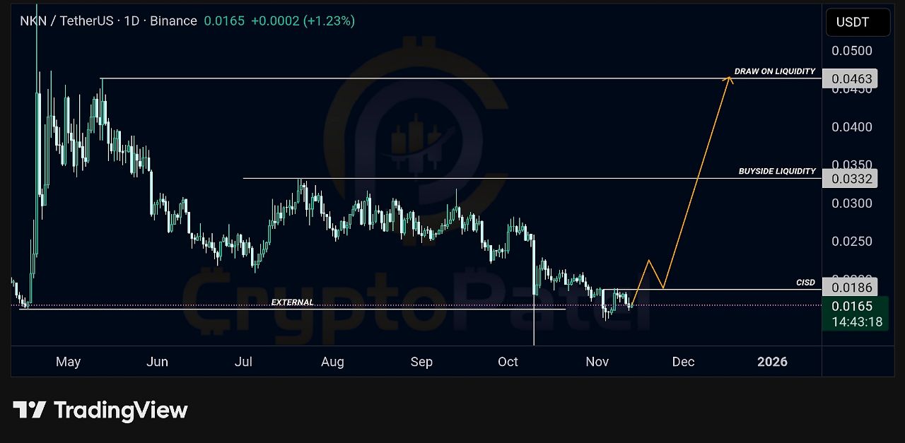 After NKN breaks above $0.0186, it is expected to rally sharply to $0.0332 and $0.0463.