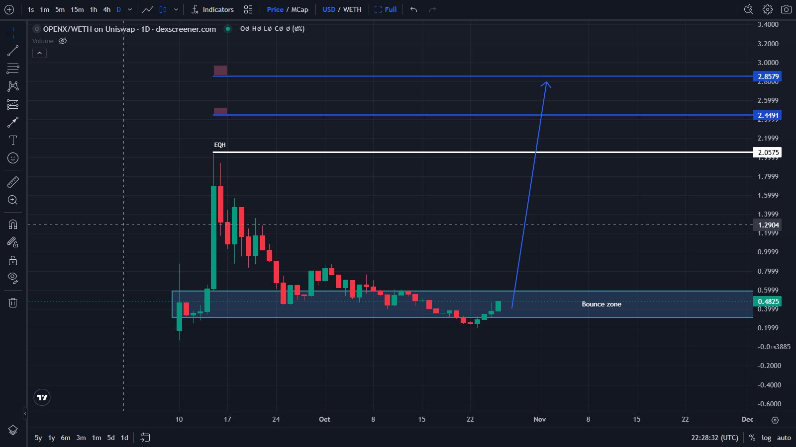 Both the tweet and chart strongly bullish on $OPENX, believing it has bottomed out and is about to enter a strong upward trend, with target prices between $2.45-$2.86.