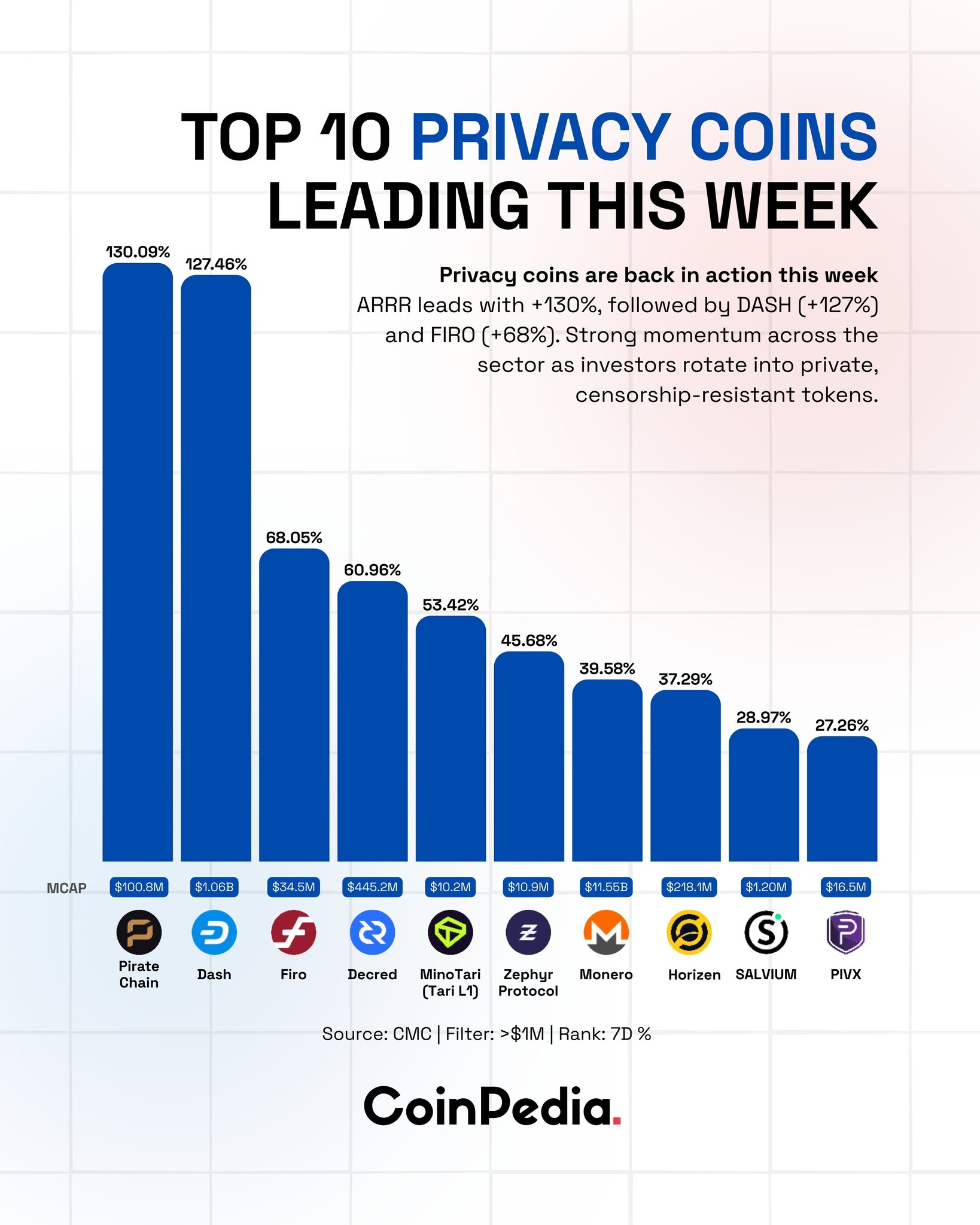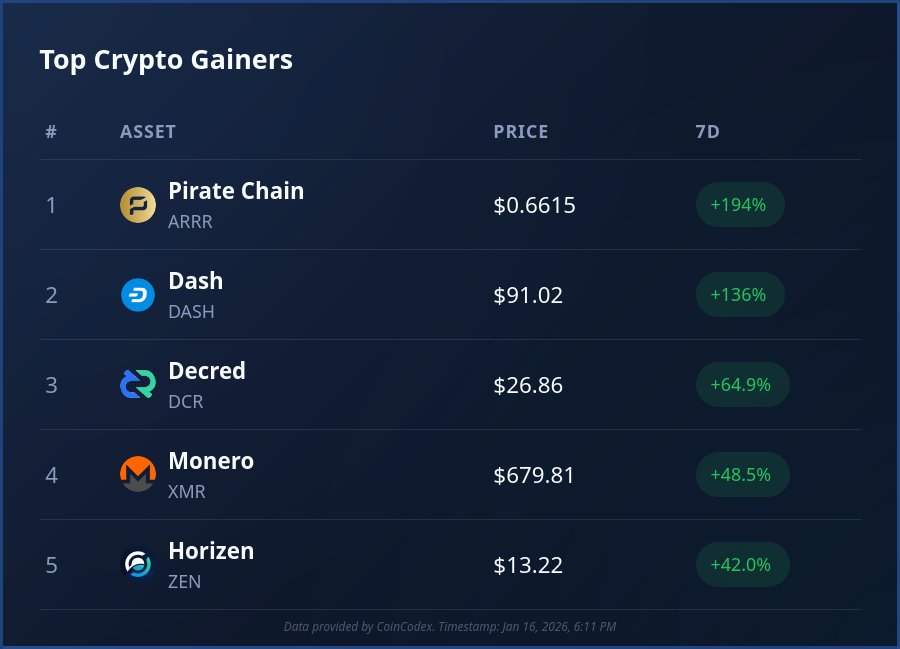 $ARRR leads the pack (+130%), with $DASH and $FIRO close behind as capital rotates into censorship-resistant assets.