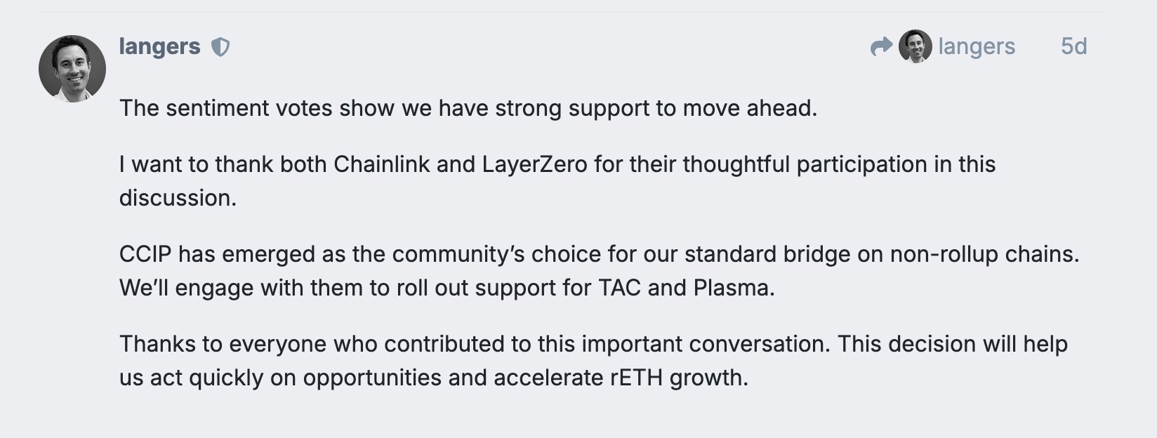 The Rocket Pool community voted to select Chainlink's CCIP as its official bridge, which is expected to accelerate rETH growth.
