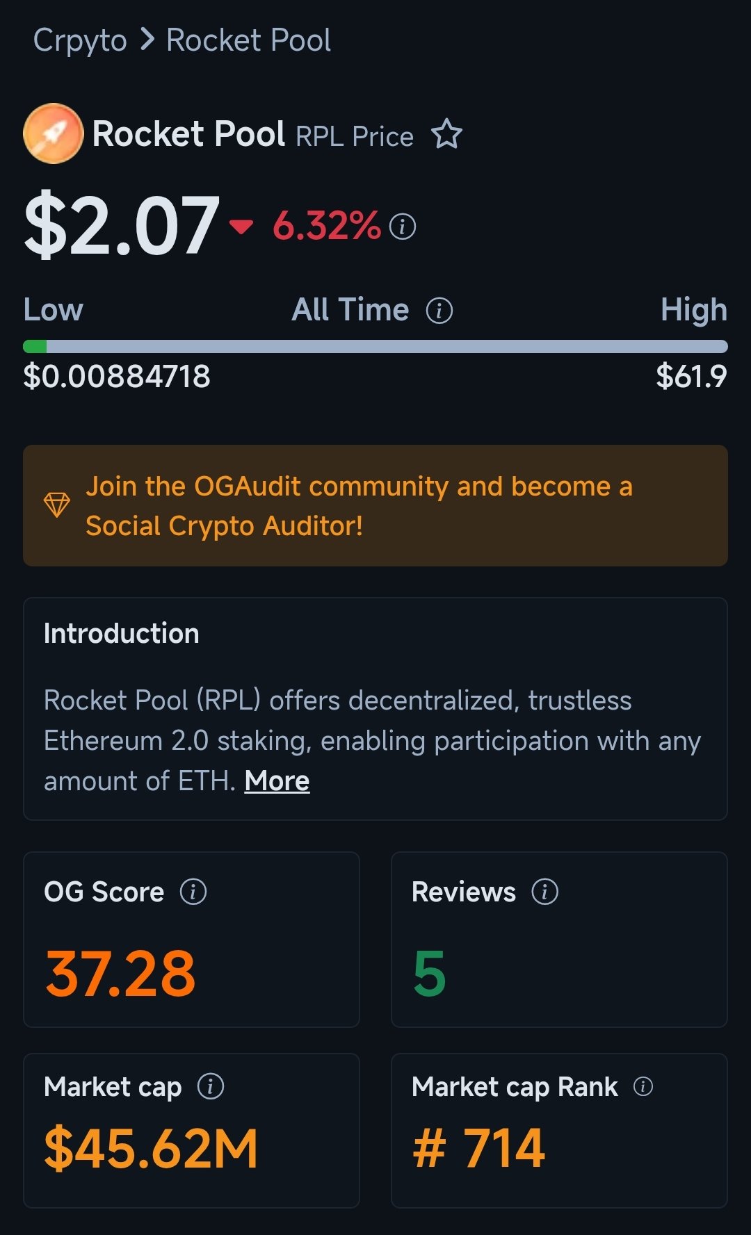 OGAudit introduces RPL, decentralized ETH staking, current price down.