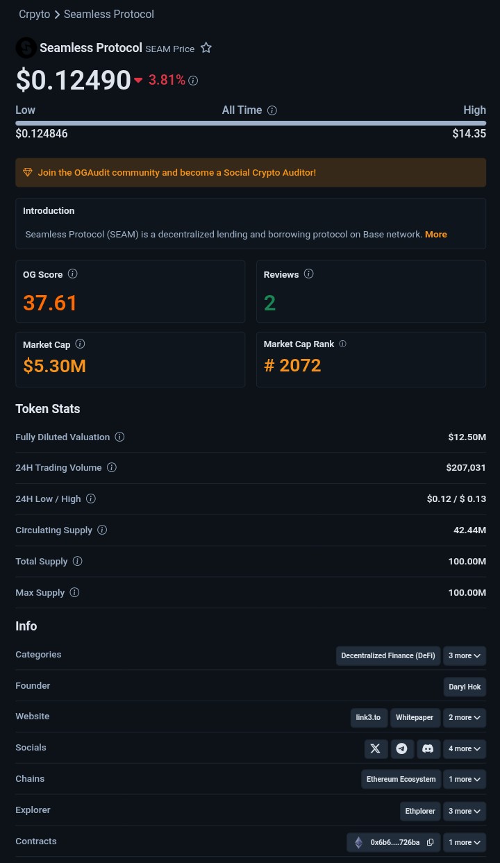 OGAudit introduces Seamless Protocol, its current price is declining, and its OG Score and market cap rank are low.