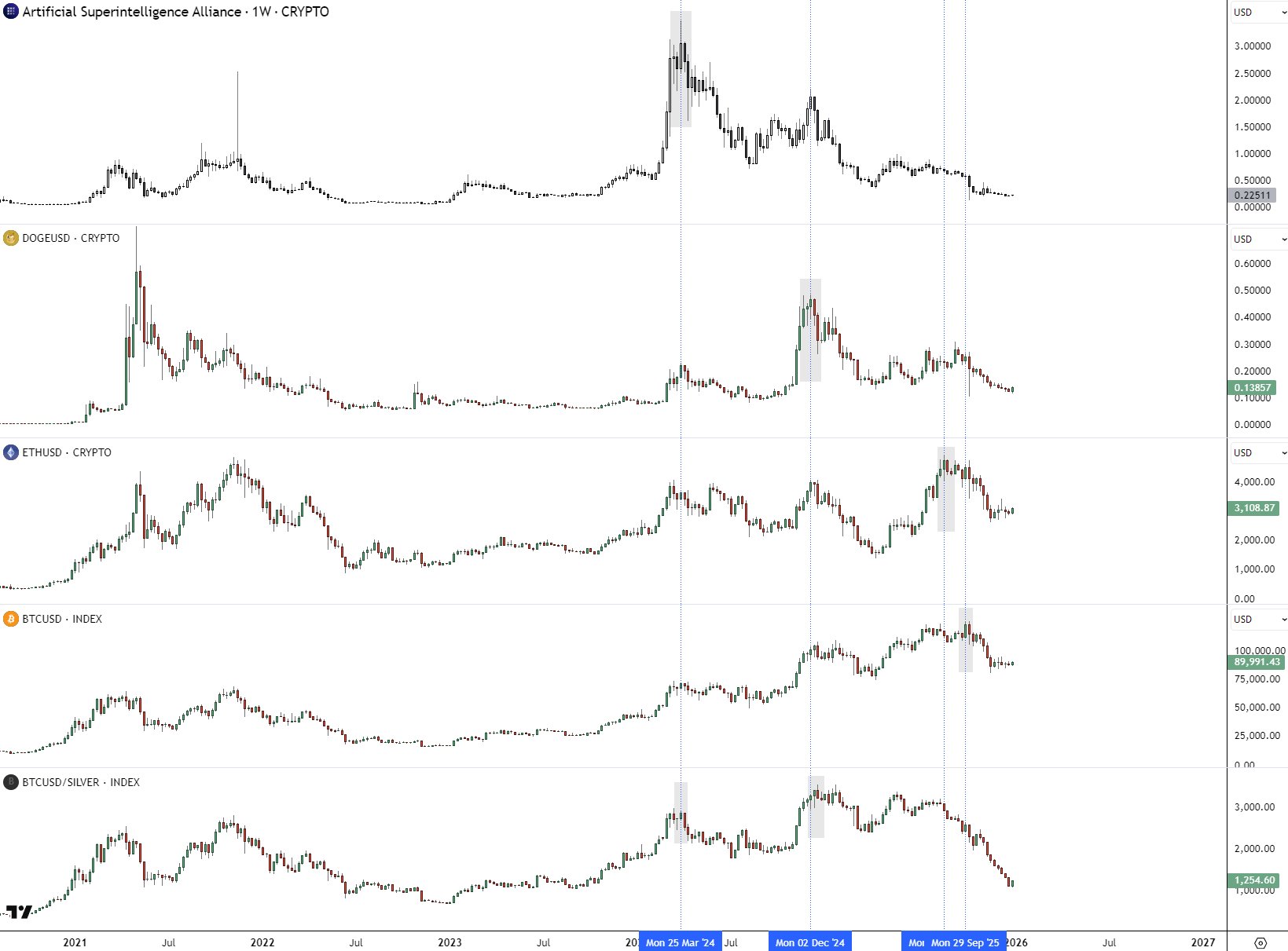 Then you have stuff like ETH that "topped" in August 25 while it remains within a macro range and BTC in Oct 25