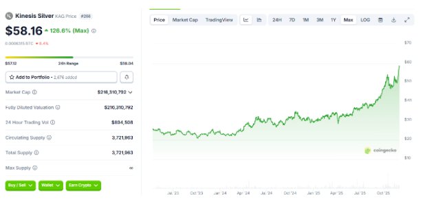Kinesis Silver (KAG) price surged, showing a strong tokenization trend for traditional assets.