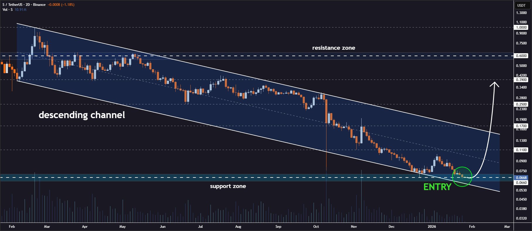 S token is retesting the lower support level of the descending channel, expected to rebound to the $0.11-$0.39 range.