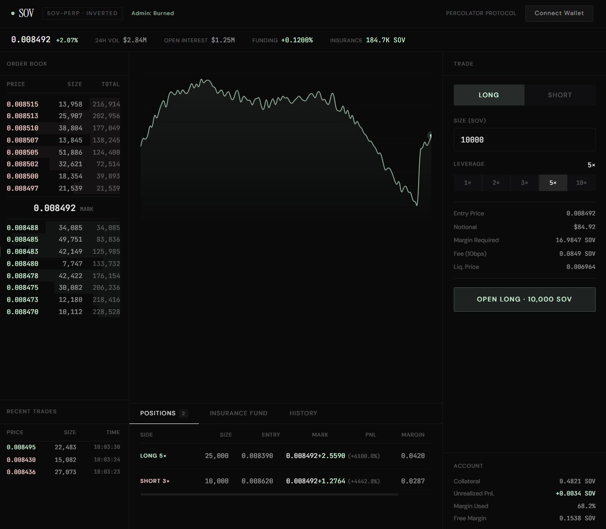 sov = percolator inverted market for the memecoin, so it’s backed by the memecoin + burn the admin key. The insurance fund will grow indefinitely from fees and will effectively be a soft burn.
