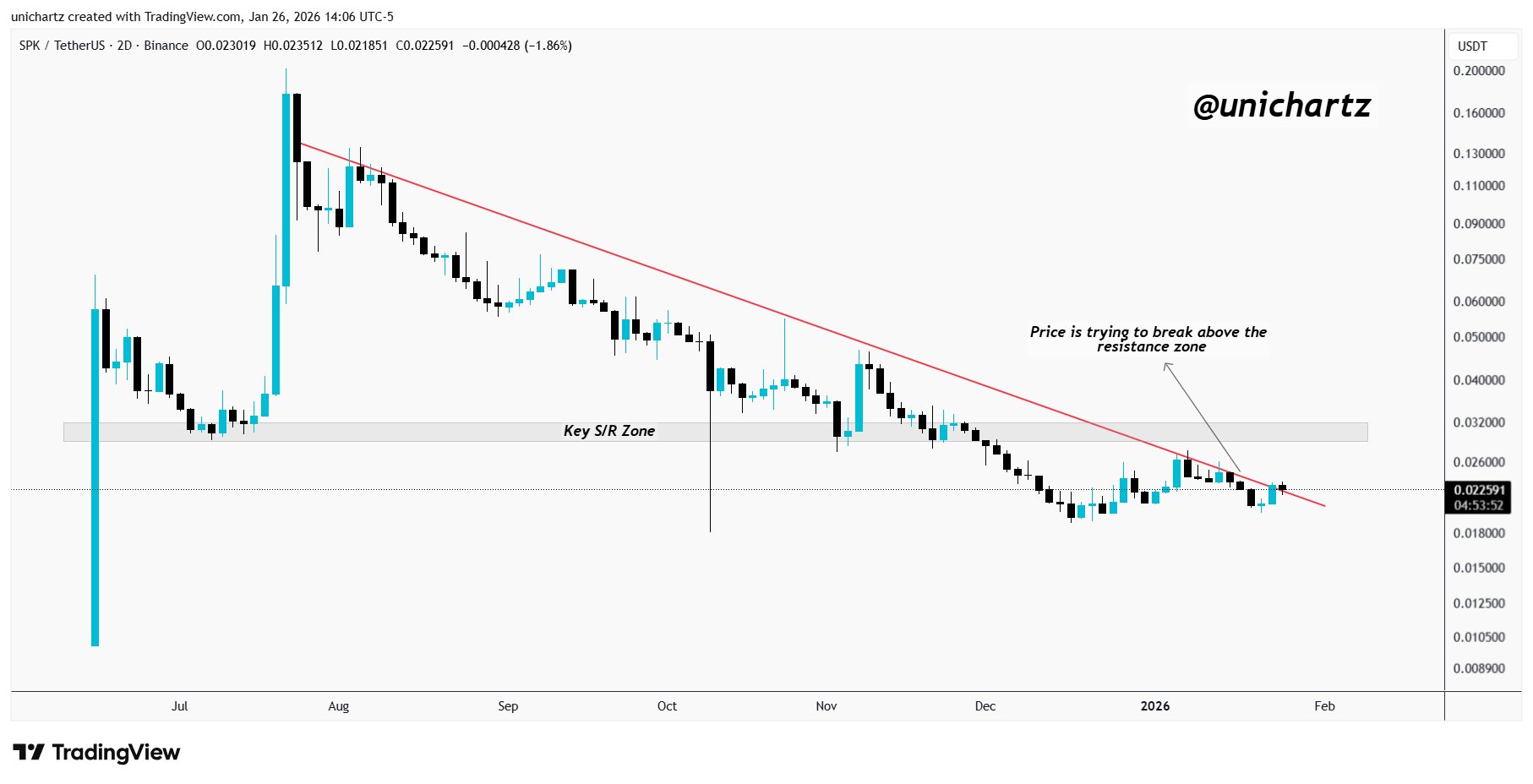 SPK is testing descending resistance after a prolonged downtrend; whether it breaks out or gets rejected will determine the trend.