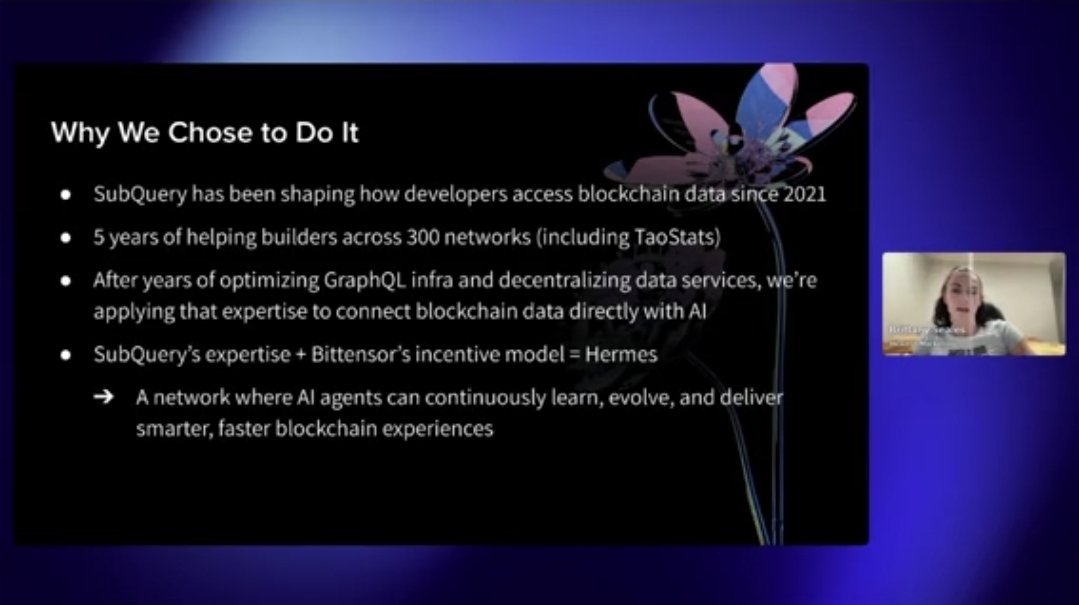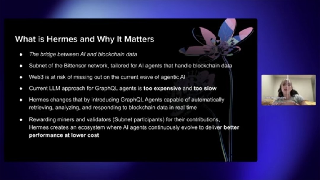 Hermes is the bridge between large language models and blockchain data. Right now LLMs struggle with on-chain queries: they’re slow, costly, and awkward when you try to surface up-to-date blockchain facts through GraphQL. Hermes solves that by introducing GraphQL agents that automatically retrieve, analyze, and respond to on-chain data in real time. Miners and validators on the subnet are rewarded for contributing, so these agents can continuously improve to deliver better performance at lower cost.