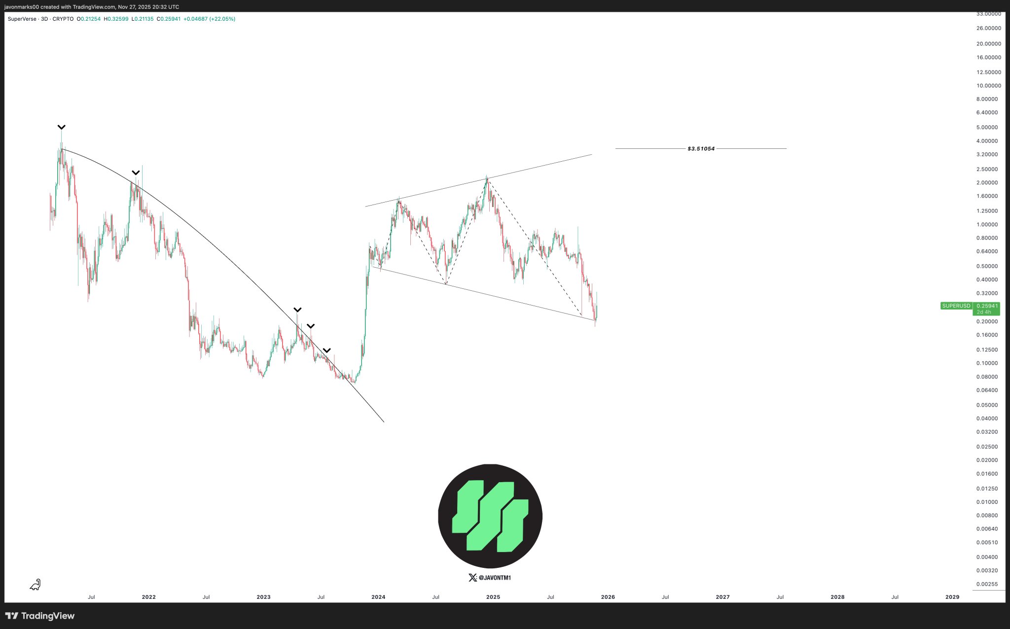 SUPER币价在拓宽楔形模式支撑位反弹,有望飙升至3.51美元目标价,涨幅超1500%。