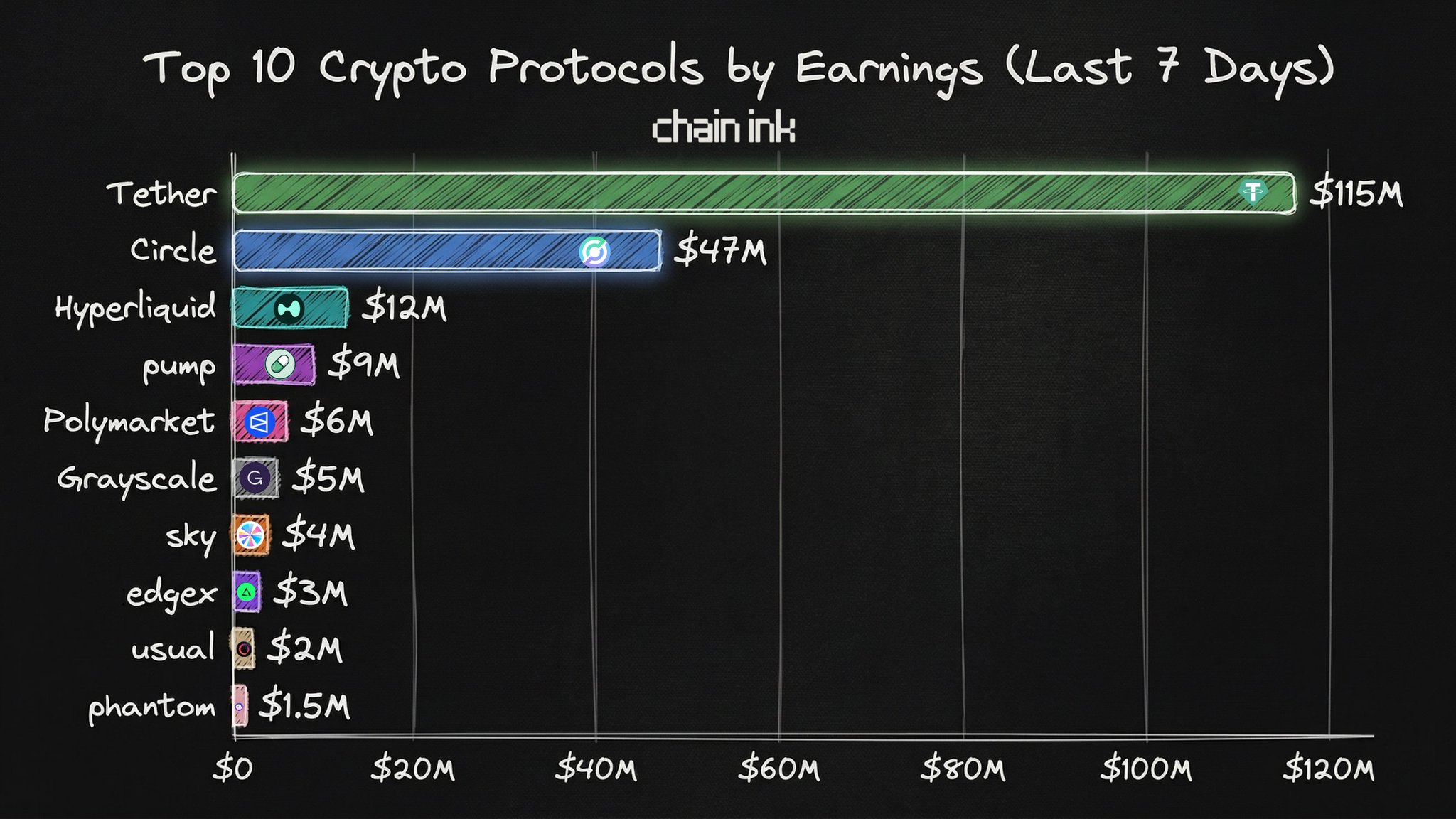 Tether, Circle and Hyperliquid rank among the top protocol revenues over the past 7 days.
