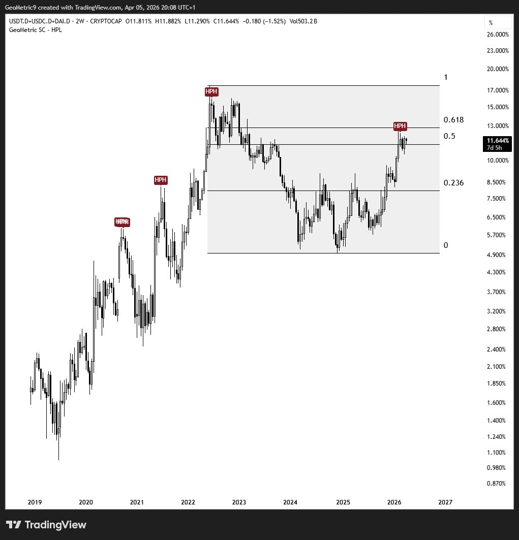 So far, this move up for stables was just a retrace to the 0.618 (precisely), yet I see so many $USDT.D bulls around. If this were any other chart there'd be a lot more people worried about the potential for a strong rejection here. https://t.co/dWMLUkwo4C