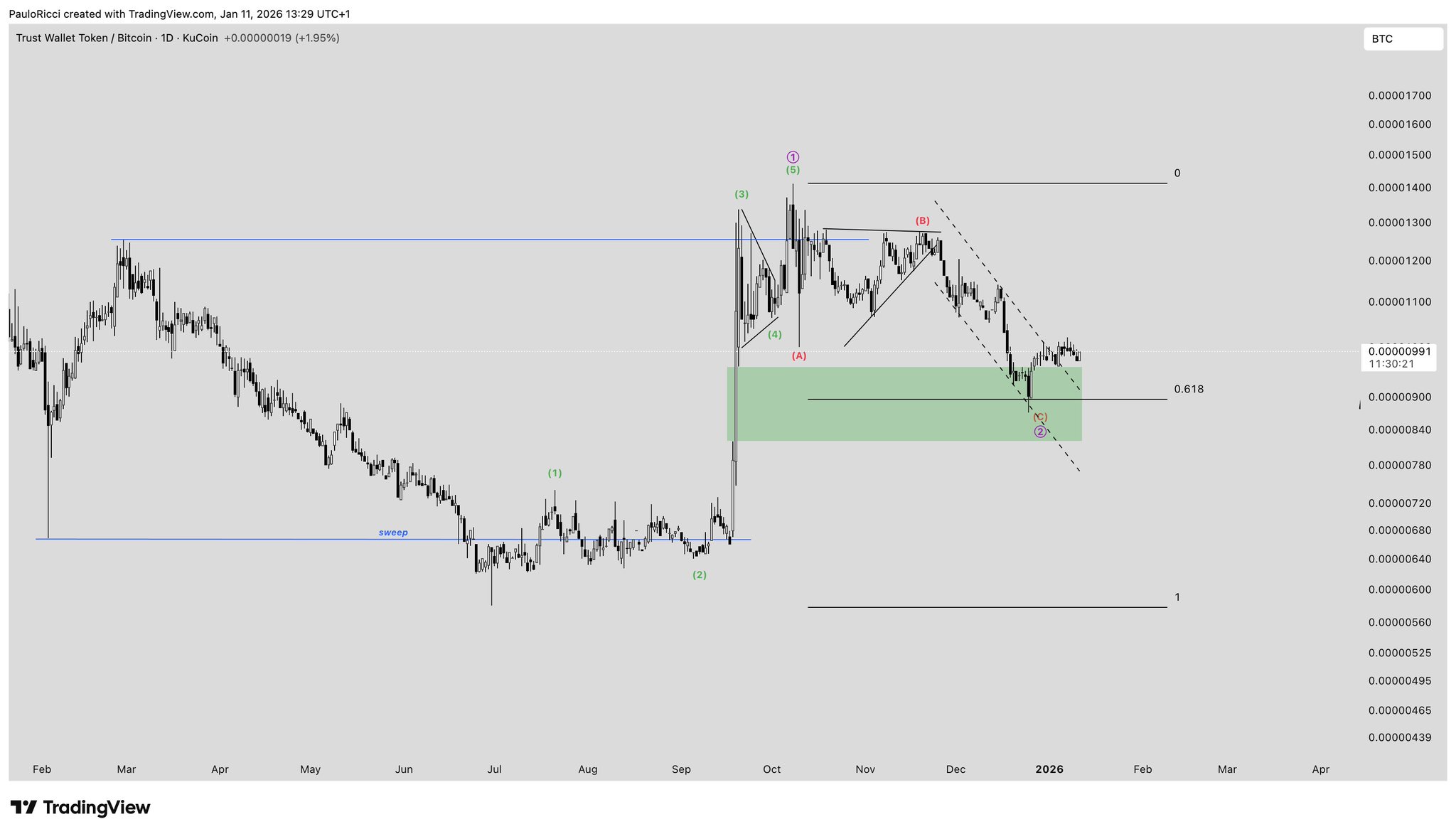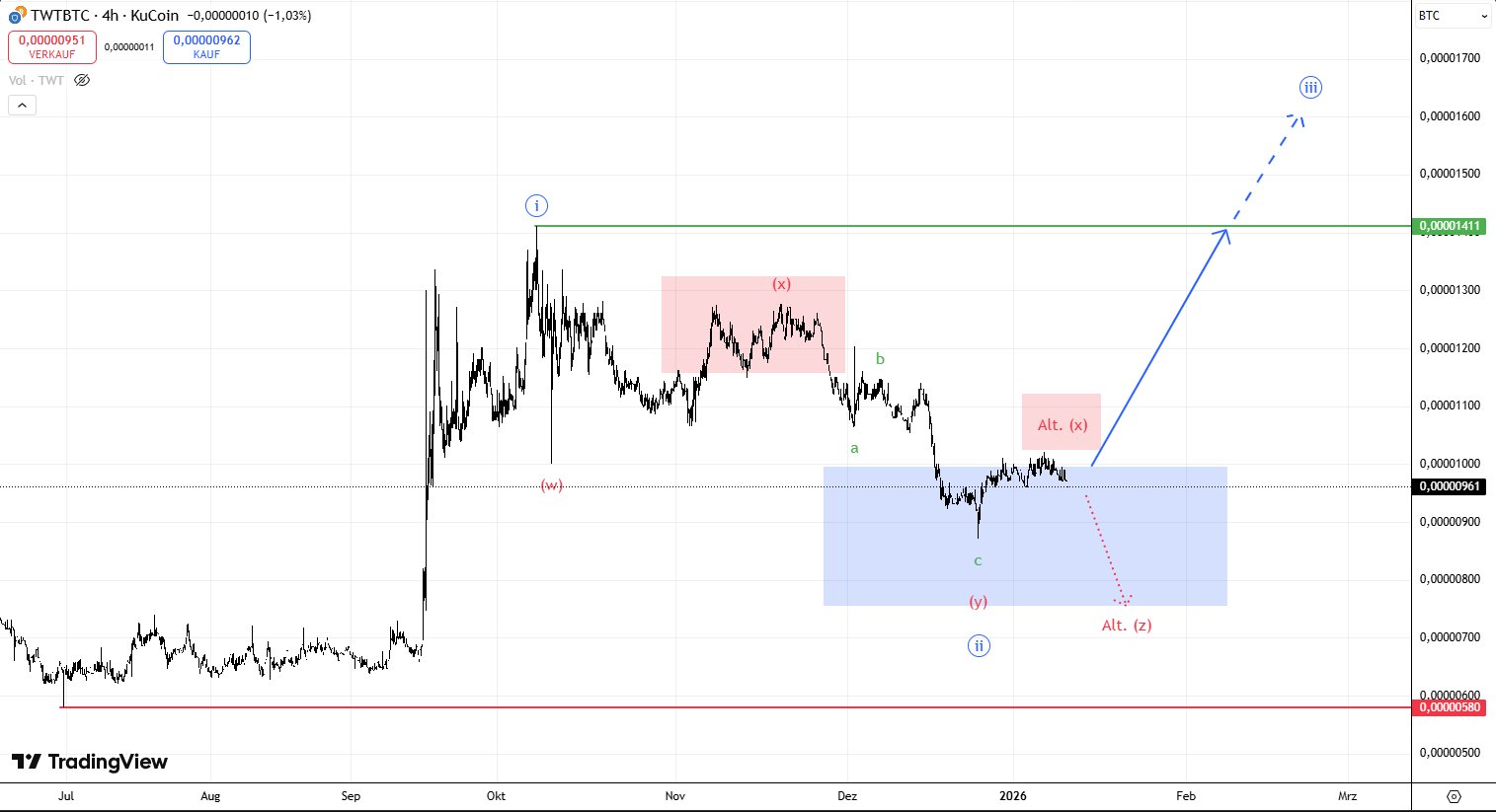 The TWT/BTC technical analysis shows a complex wave structure, indicating upward potential but requiring caution of downside risk.