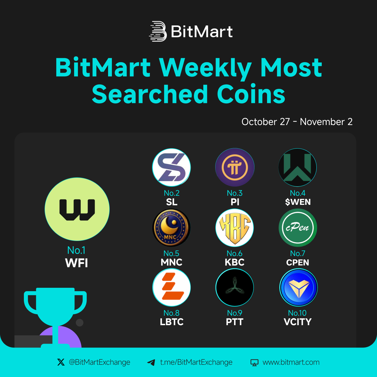 🔍 #BitMart Weekly Most Searched Coins (Oct 27 - Nov 2)