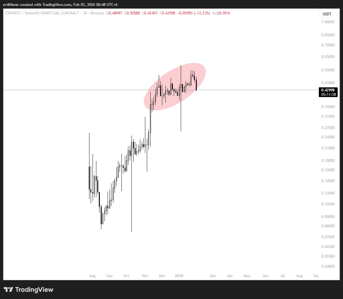 The tweet suggests continuously buying ESPORTS, and the chart shows that after a sharp rise it is now in a consolidation phase.