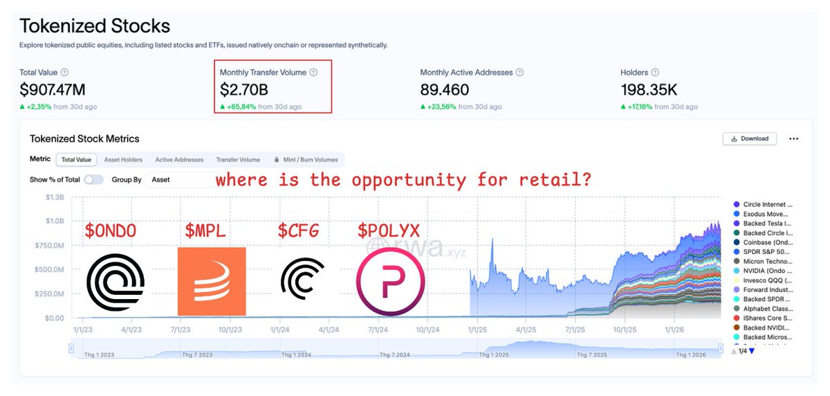 Tanaka DeFi_Expert FA_Analyst B46.76K @Tanaka_L2If you ask me what the next market trend is, I would say tokenized stocks 🧵 Because at the end of the day, it’s solving real demand. I personally want exposure to US equities, but there are still too many barriers. Even when access is possible, it often goes through intermediaries, and you still depend on brokers, which adds layers of risk. That’s why tokenized stocks make sense. It opens access for non-US users to gain exposure to US equities directly onchain. And it’s quietly becoming one of the biggest narratives within RWA. I believe it’s only a matter of time before this sector accelerates. If we look at current data: – Tokenized stocks TVL has crossed ~$1B – Monthly transfer volume ~$2.5-2.7B – ~180K–200K holders and ~85K-90K active addresses – Total RWA market: ~$23-26B (roughly 3-4x YoY growth) → The data is already pointing in one direction: this sector is still early and continuing to expand. What matters even more is capital flow and adoption: – Ondo holds roughly ~55-65% market share in to