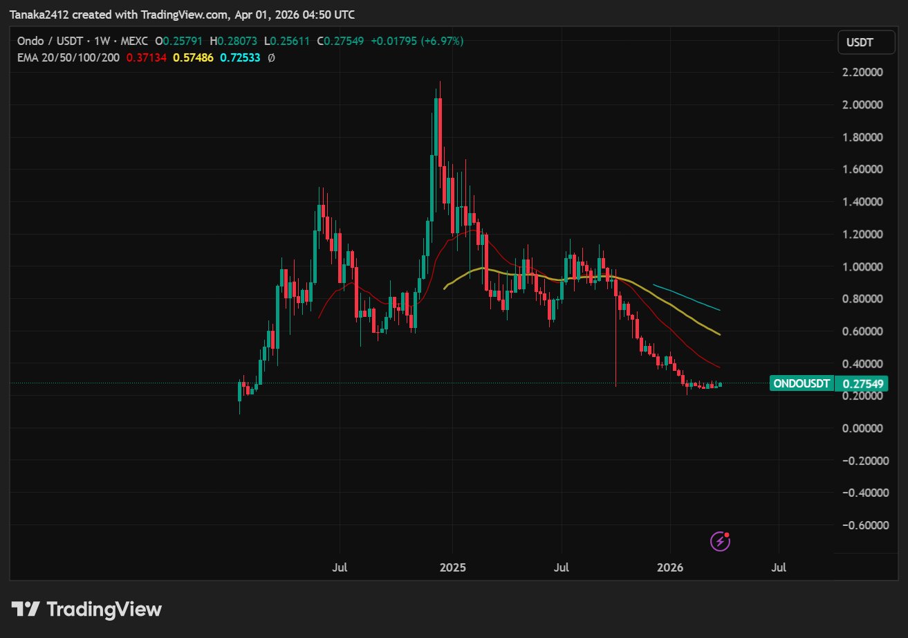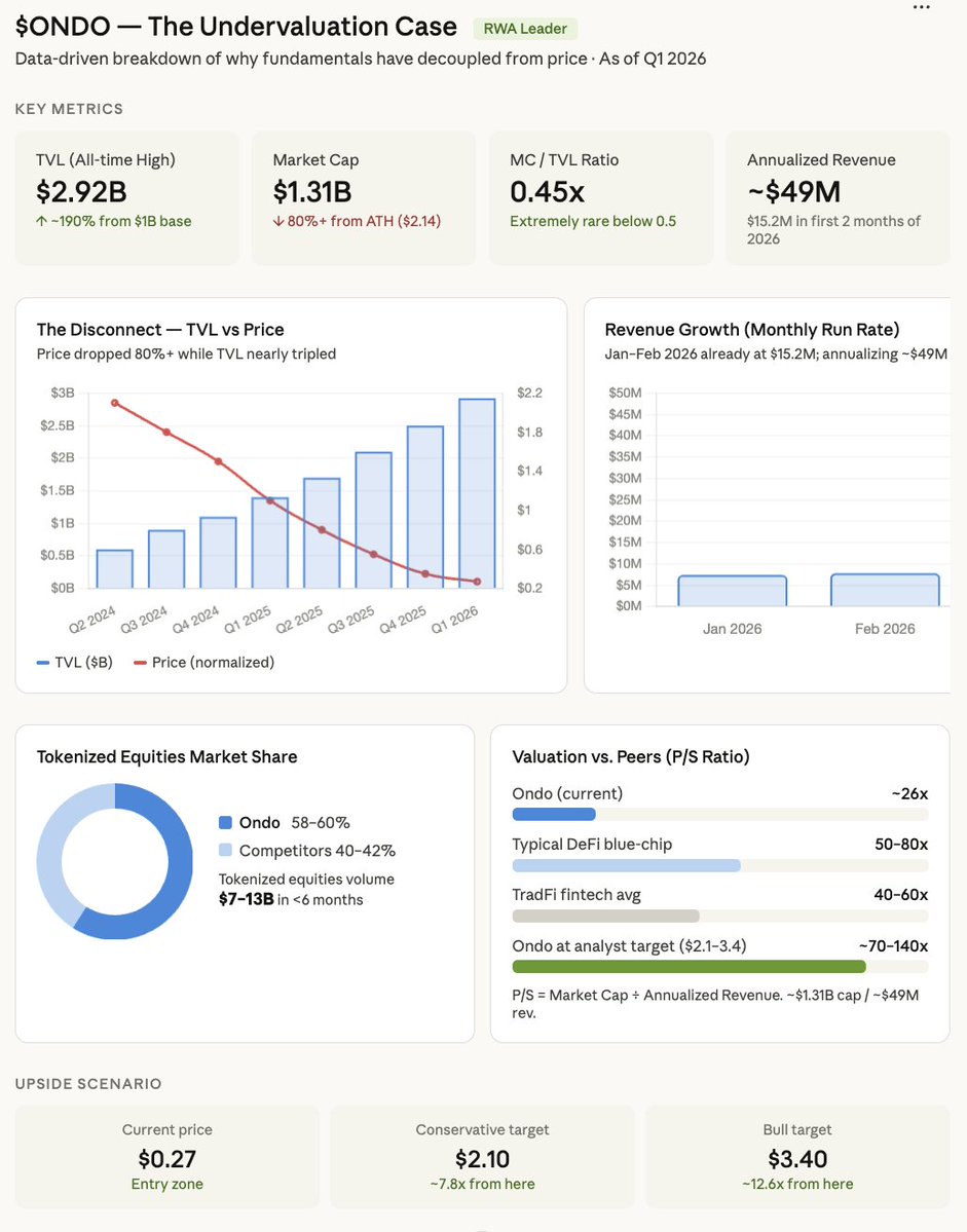 Tanaka DeFi_Expert FA_Analyst B46.76K @Tanaka_L2I just sold all my $LTC and went all in on $ONDO | @OndoFinance Yeah, I didn’t FOMO. This decision came after I spent a lot of time digging into the project. $ONDO is clearly one of the most undervalued tokens right now. Why do I say that? Because fundamentals are going up, but the price hasn’t reflected the true value yet. Let’s look at the current data: – TVL: ~$2.919B (new ATH). – Market Cap: ~$1.31B → MC/TVL ≈ 0.45 – Tokenized stocks TVL: >$700M (~58–60% market share). – Tokenized treasuries: ~$2B TVL (largest in the market). → MC/TVL below 0.5 is extremely rare for top-tier protocols. → This usually signals the market is underpricing adoption. Not only that, Ondo is clearly leading the RWA space, especially in tokenized stocks, a segment I rate very highly in terms of potential. – Tokenized equities volume: >$7–13B in less than 6 months. – Revenue (first 2 months of 2026): ~$15.2M. – Annualized fees: ~$48.95M. → Top-tier revenue, yet market cap is still only ~$1.3B, which honestly doesn’t make much sense. What caught my attention even more is the “disconnect”: – Price is down >80% from ATH (~$2.14). – TVL increased significantly (~$1B → ~$2.9B). – Tokenized equities TVL grew 27% in just one month. → Fundamentals are going up, but price is going down, even though there were no token unlocks until Jan 27, 2026. This likely means early buyers at higher levels lost patience and exited at a loss. From a valuation perspective: – ~$50M annual revenue. – ~$1.3B market cap → very low P/S ratio. – Analyst targets: $2.1–3.4 (~7–12x upside) Personally, I think at the ~$0.26-0.27 range, $ONDO is clearly undervalued. Onchain growth, market share, and revenue are all increasing, but price hasn’t caught up yet. → This is the opportunity. The market will recognize it sooner or later. Bookmark this tweet and check back in 6–9 months. Just buy and hold $ONDO. Ofc, NFA. (Personal research)