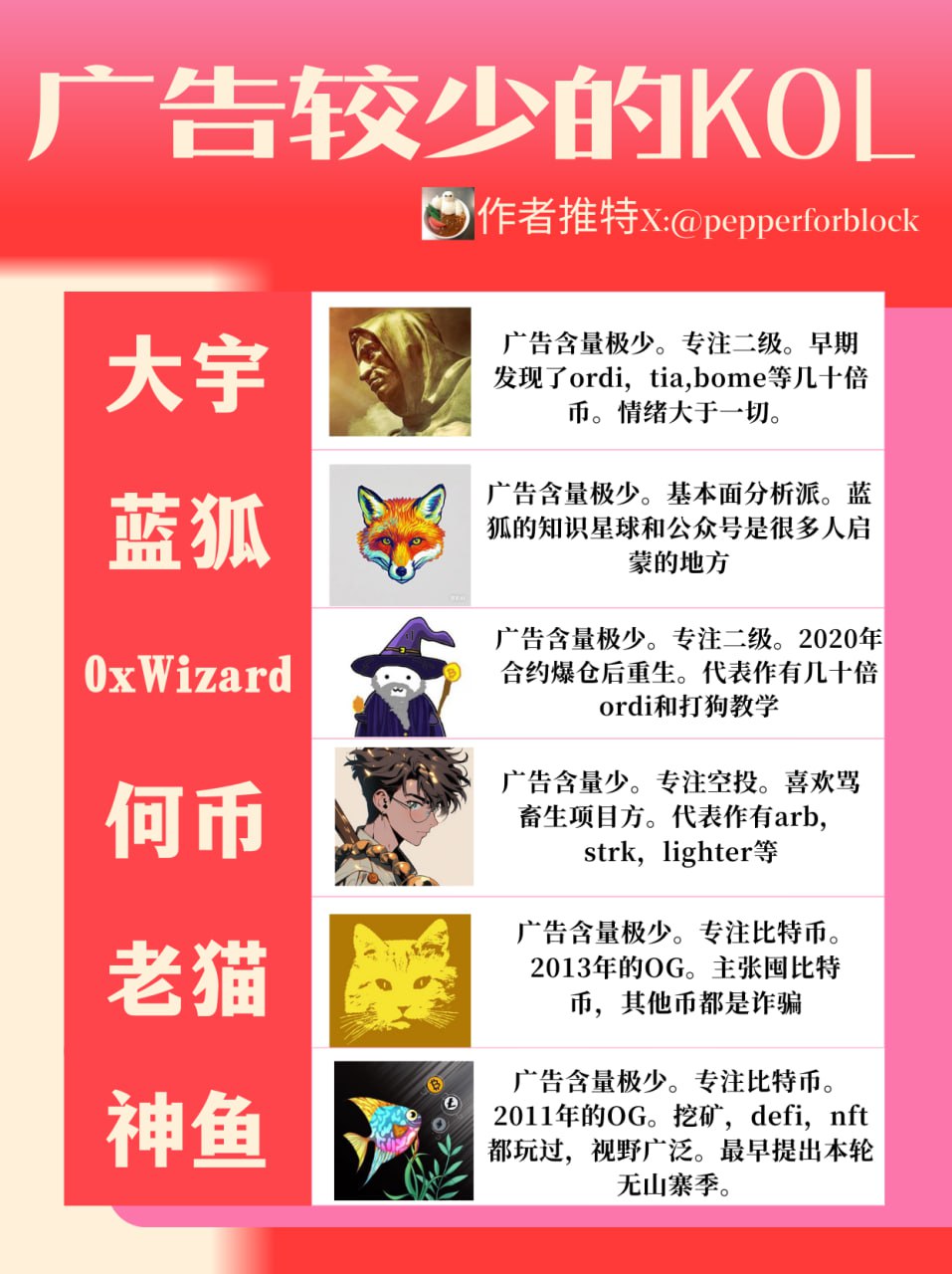 Ad content is minimal. Focuses on secondary markets. In 2020 suffered a contract liquidation, later rebounded through DeFi. Only those who have experienced pain have deep insights; the wizard’s style is relatively cautious—he may go months without calling a coin, but the coins he does call are highly likely ones he personally holds and researches. Notable projects this cycle include the dozens‑times gain on ordi and secondary‑market “dog‑hunting” teachings.