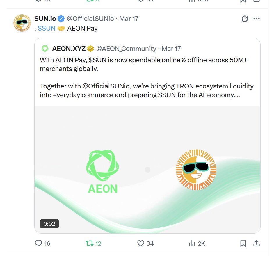 AEON.XYZ D73.95K @AEON_CommunityWith AEON Pay, $SUN is now spendable online & offline across 50M+ merchants globally. Together with @OfficialSUNio, we’re bringing TRON ecosystem liquidity into everyday commerce and preparing $SUN for the AI economy. https://t.co/XctPc3rNKM https://t.co/TeTDBTsNGy