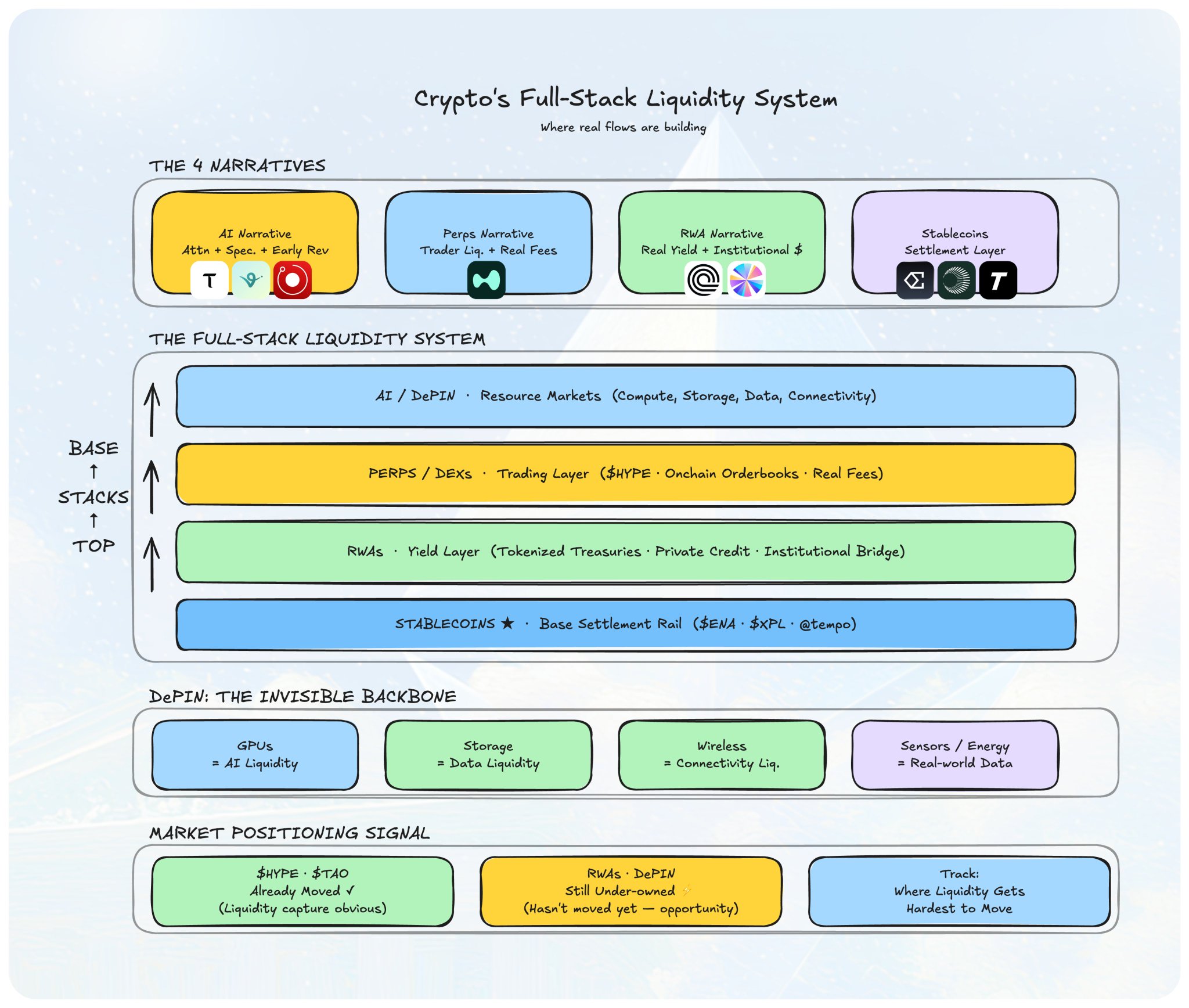 → RWAs bring in external yield → anchors the system of all above sectors into one single liquidity layer