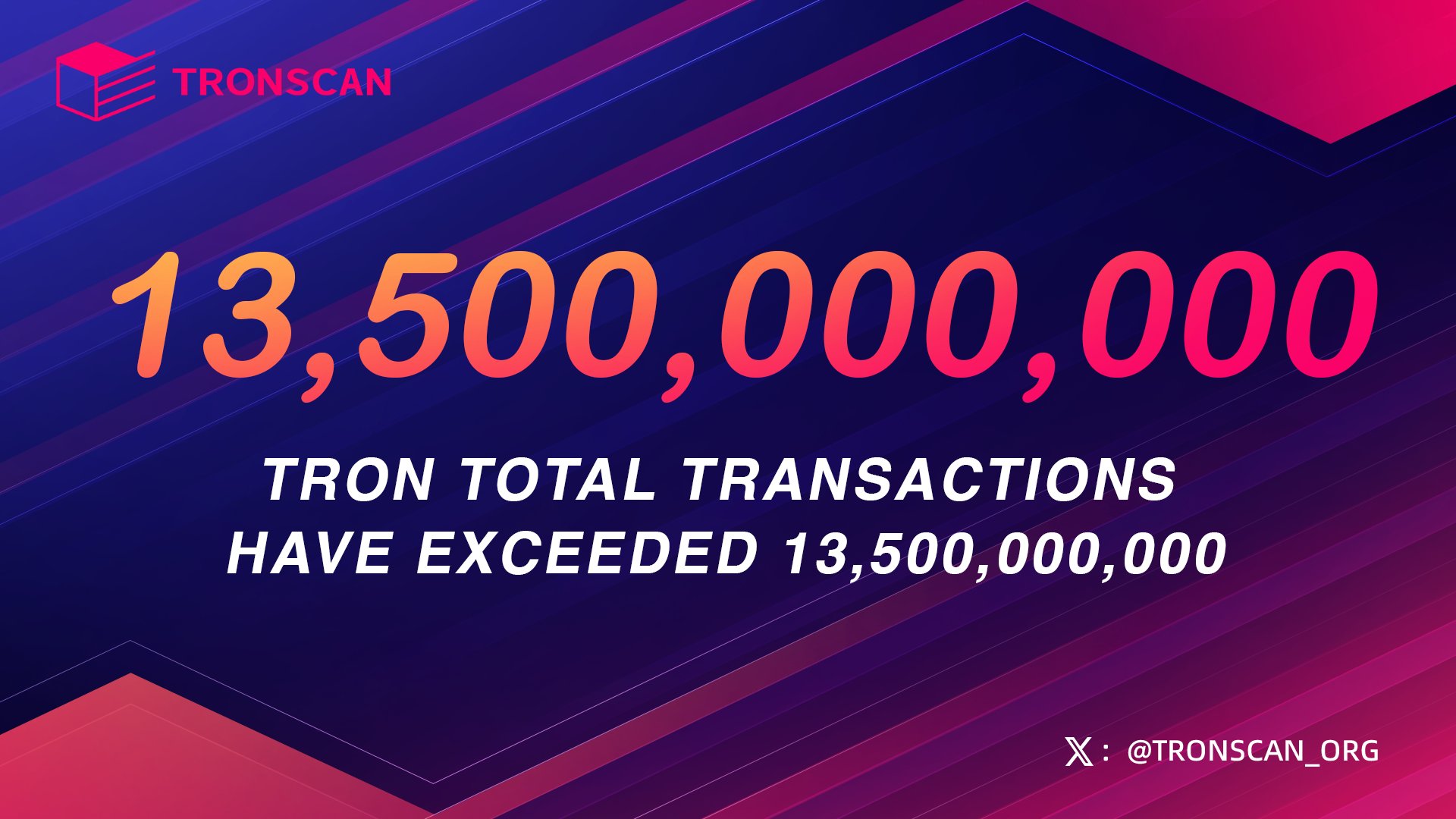 TRONSCAN D44.96K @TRONSCAN_ORG👏Congratulations! The total transactions on TRON exceeded 13.5 billion. With 372M+ total accounts, TRON continues to strengthen its position as one of the world’s leading blockchain networks. https://t.co/LqsmGJTsxu