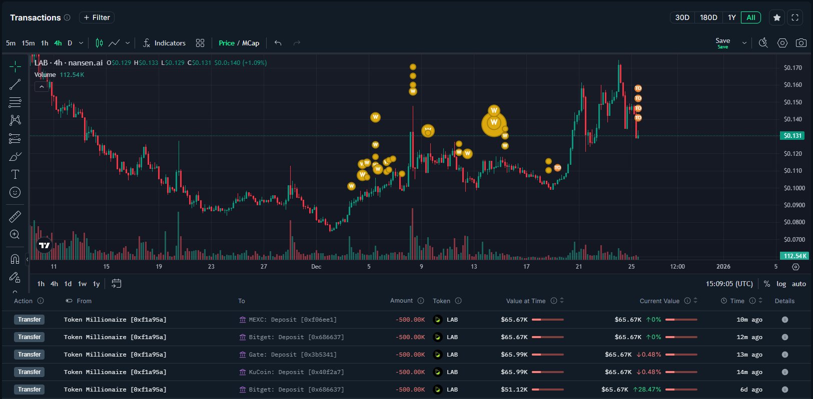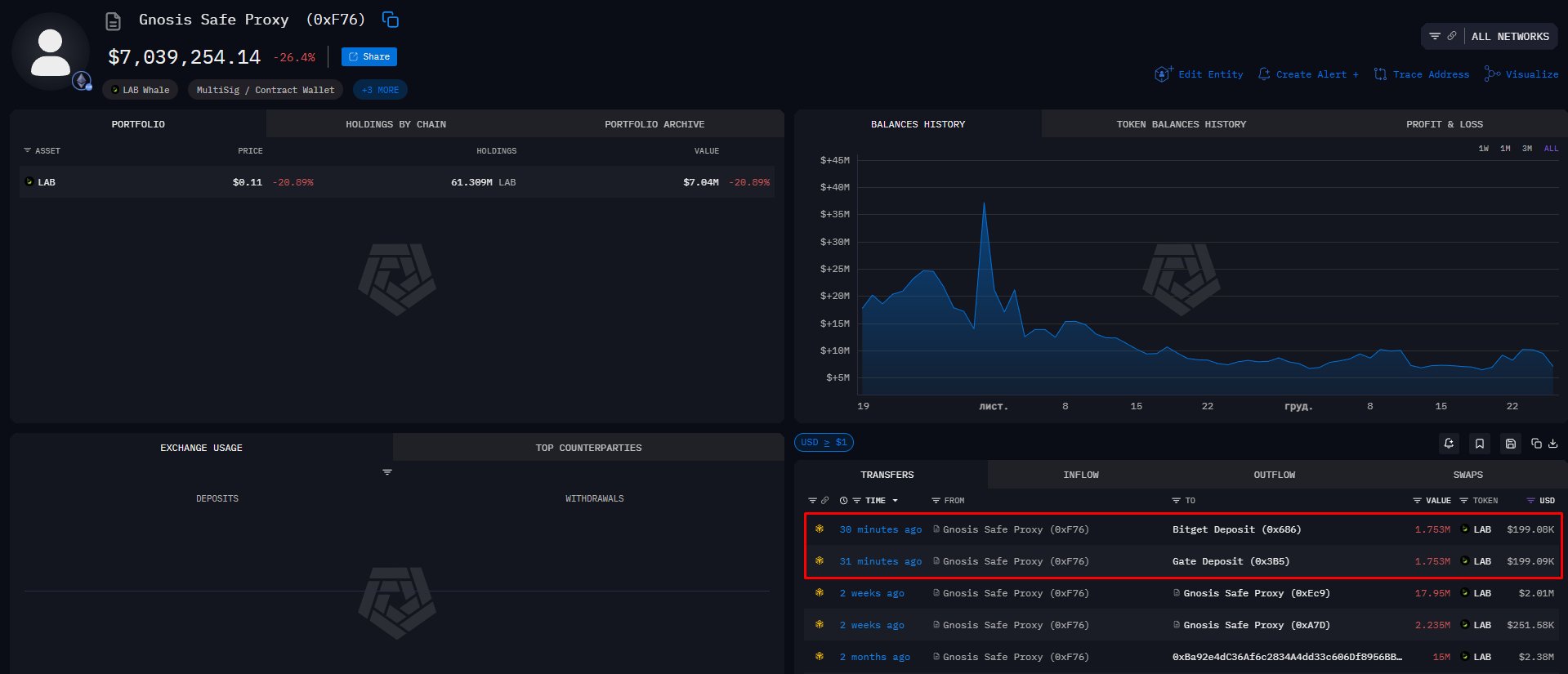 11 2 1.73K Gốc >Xu hướng của LAB sau khi phát hànhGiảm giáA LAB token whale is depositing a large amount of assets into exchanges, indicating potential sell pressure, but still holds most of the position.