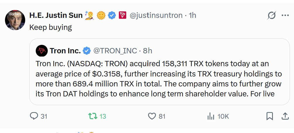 H.E. Justin Sun 👨🚀 🌞 Founder Influencer D3.96M @justinsuntron56 319 17.08K Gốc >Xu hướng của TRX sau khi phát hànhTrung tính