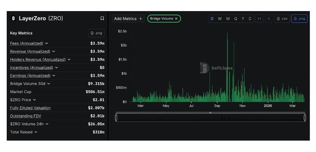 Despite ~$150B+ annualized volume, protocol revenue is near zero because fees go to DVNs and Executors.