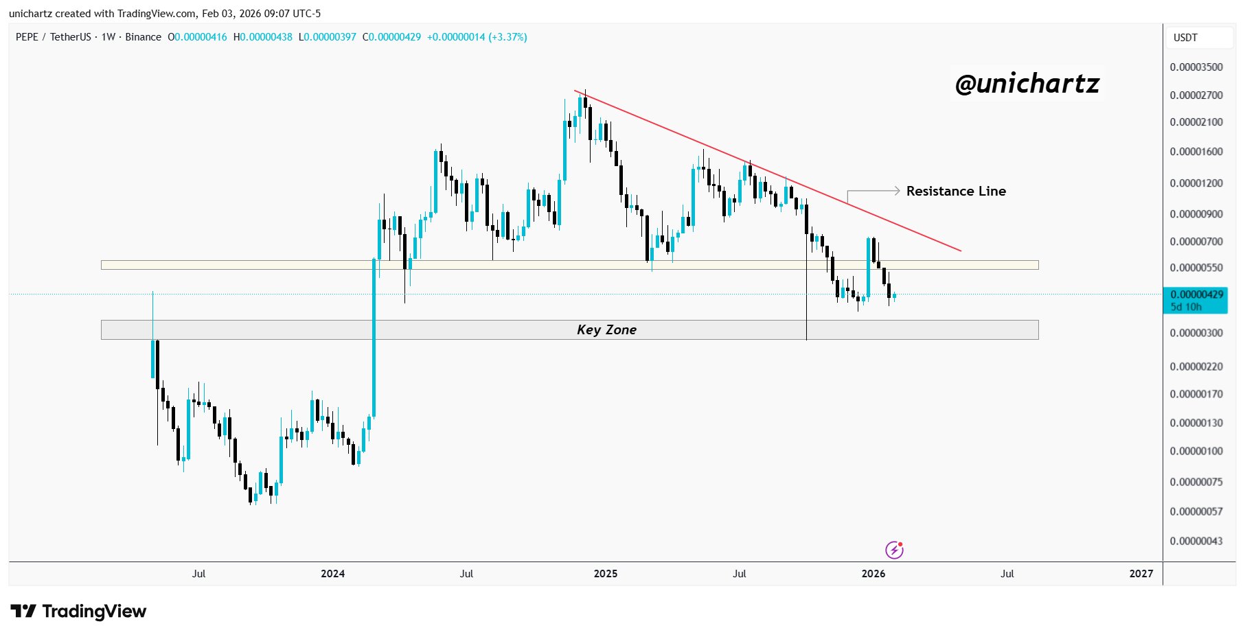 $PEPE is in a clear downtrend, respecting that descending resistance line. Every bounce so far has been sold into.