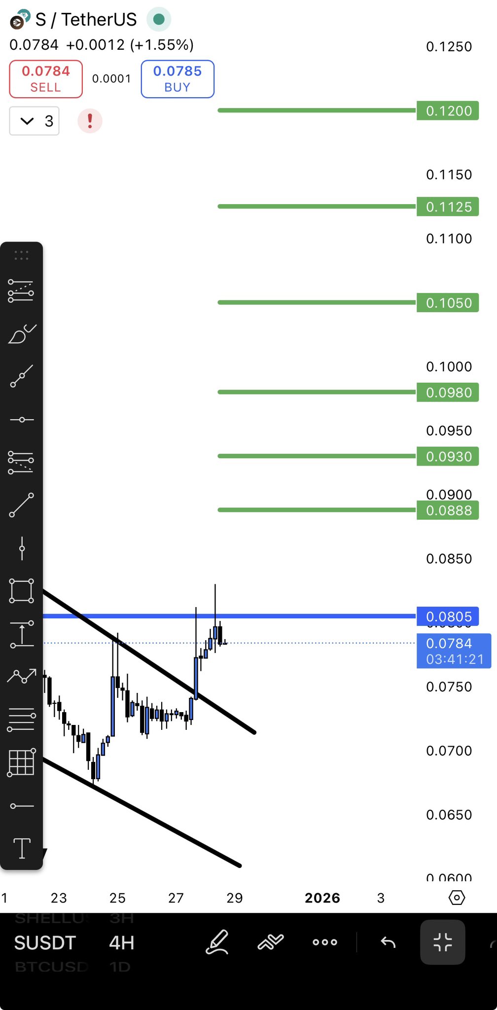 $S #S 该币需要在4小时蓝线以上收盘才能走向目标并达成目标 必须突破并在4小时上方收盘 🫡 https://t.co/yt0D6KYLYc