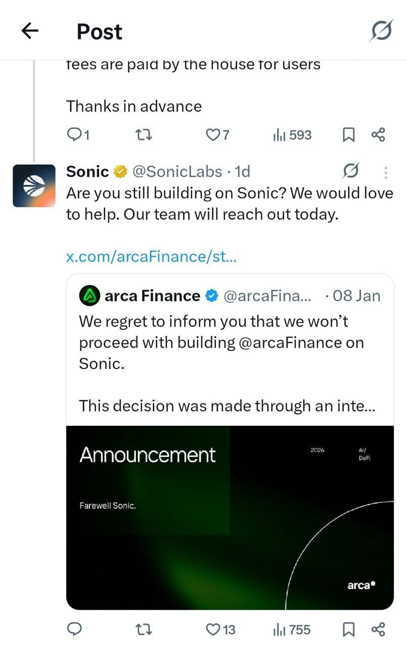 很遗憾地通知您,我们将不会继续在 Sonic 上构建 @arcaFinance。 此决定是通过内部投票作出的。 在重新评估情况后,我们得出结论,在当前的不确定性水平下,无法满足必要条件。 告别,Sonic https://t.co/BZeZGJKyR3