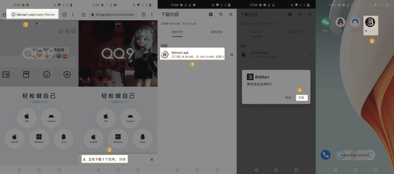 • 打开【QQ浏览器】,将【复制链接】输入到浏览器中点击【进入】进行下载,下载完成点击【安装】。如果遇到提示,则进入【设置】,打钩【允许访问】后就可以顺利安装了,最后界面上出现APP即表示安装完成。