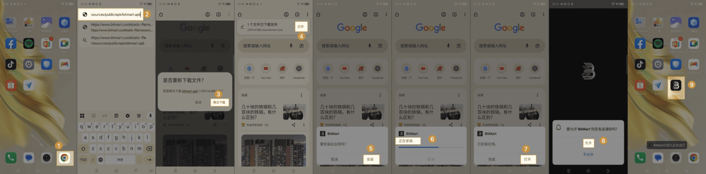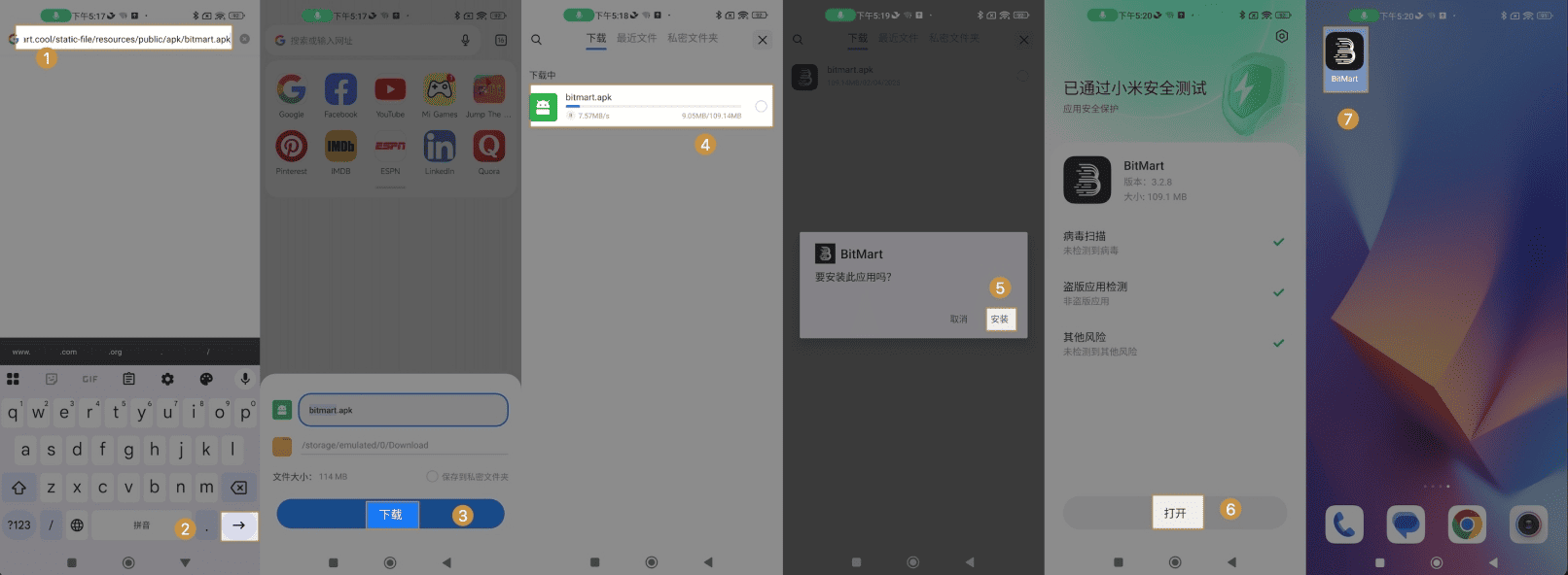 • 打开【自带浏览器】,将【复制链接】输入到浏览器,浏览器会自动进行下载,下载完成点击【安装】。最后界面上出现APP即表示安装完成。