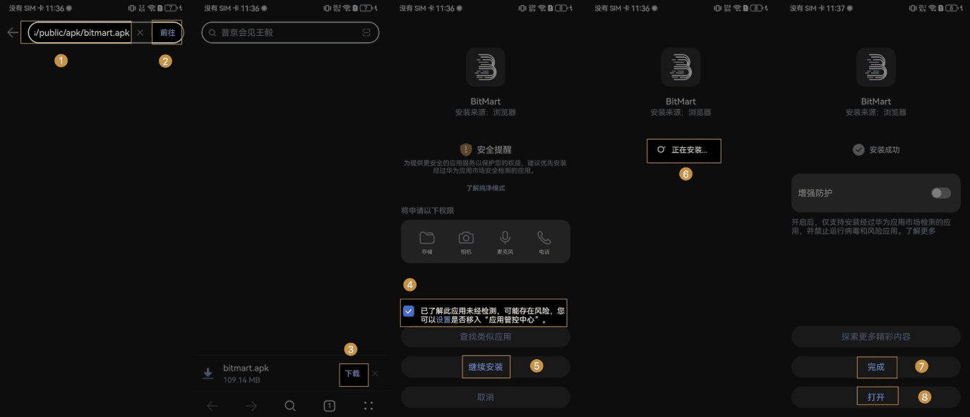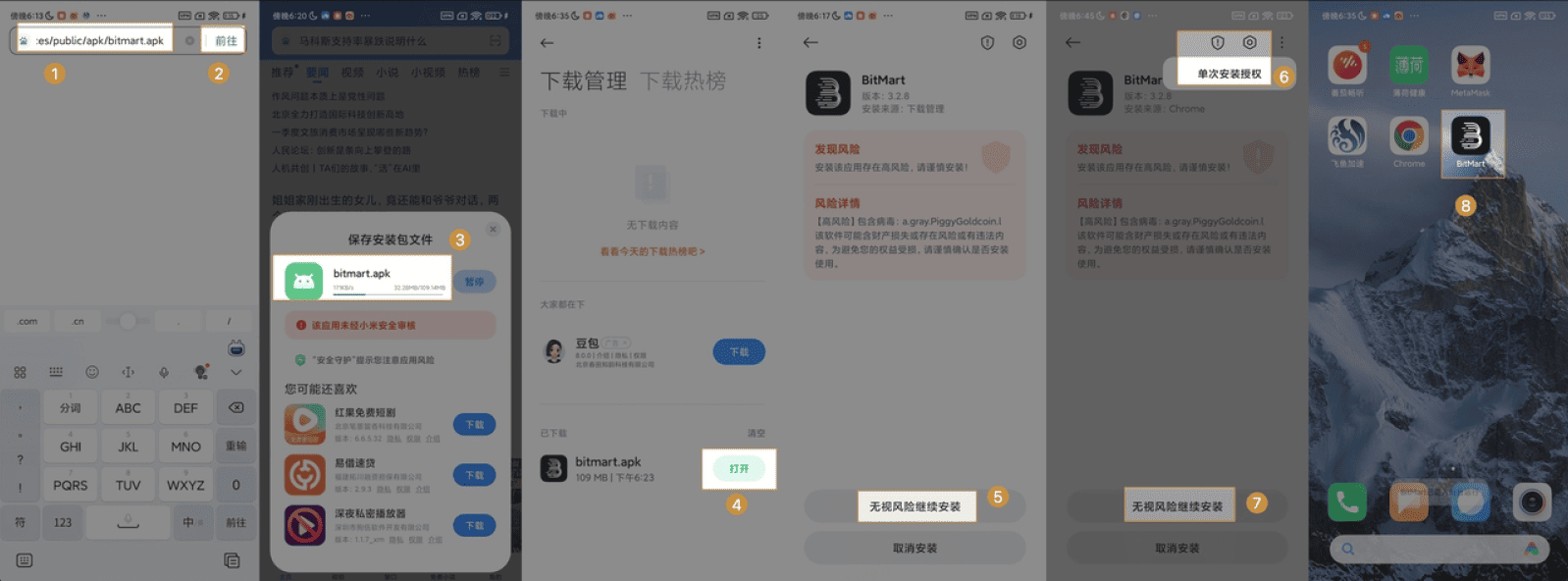 • 打开【自带浏览器】,将【复制链接】输入到浏览器中点击【进入】进行下载,下载完成点击【打开】。如果遇到风险提示,则点击【单次安装授权】后就可以顺利安装了,最后界面上出现APP即表示安装完成。