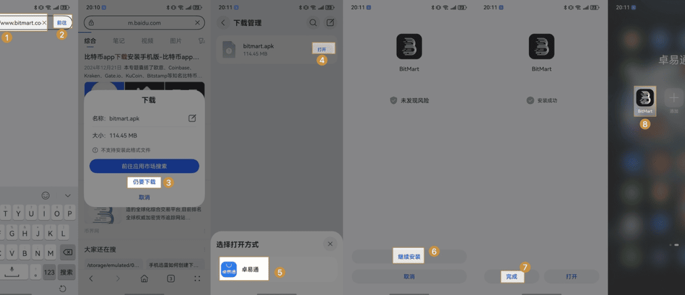 • 打开【自带浏览器】【复制链接】到浏览器中点击【前往】进行下载,遇到提示点击【仍要下载】,下载完成使用【卓易通】进行安装了,最后界面上出现APP即表示安装完成。