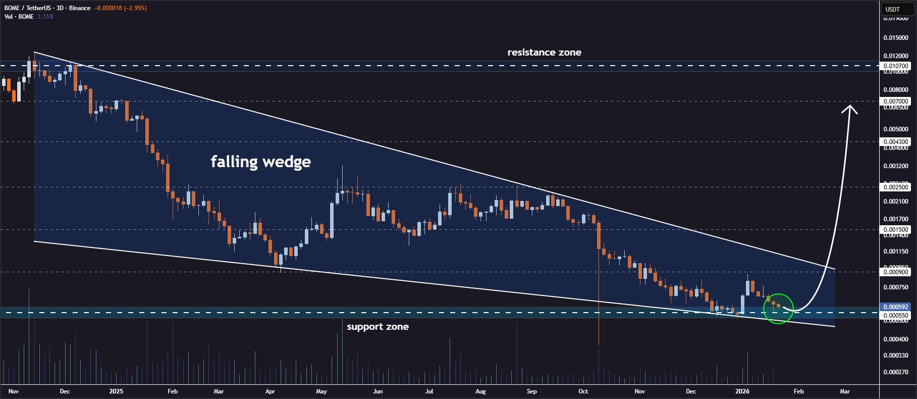 BOME下降楔形支撑位重测成功,买盘增加,看涨至0.0070美元。