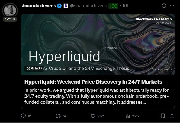 📡 @shaundadevens 提交了 CFTC 申请:Hyperliquid 今日已准备好进行 24/7 股票交易