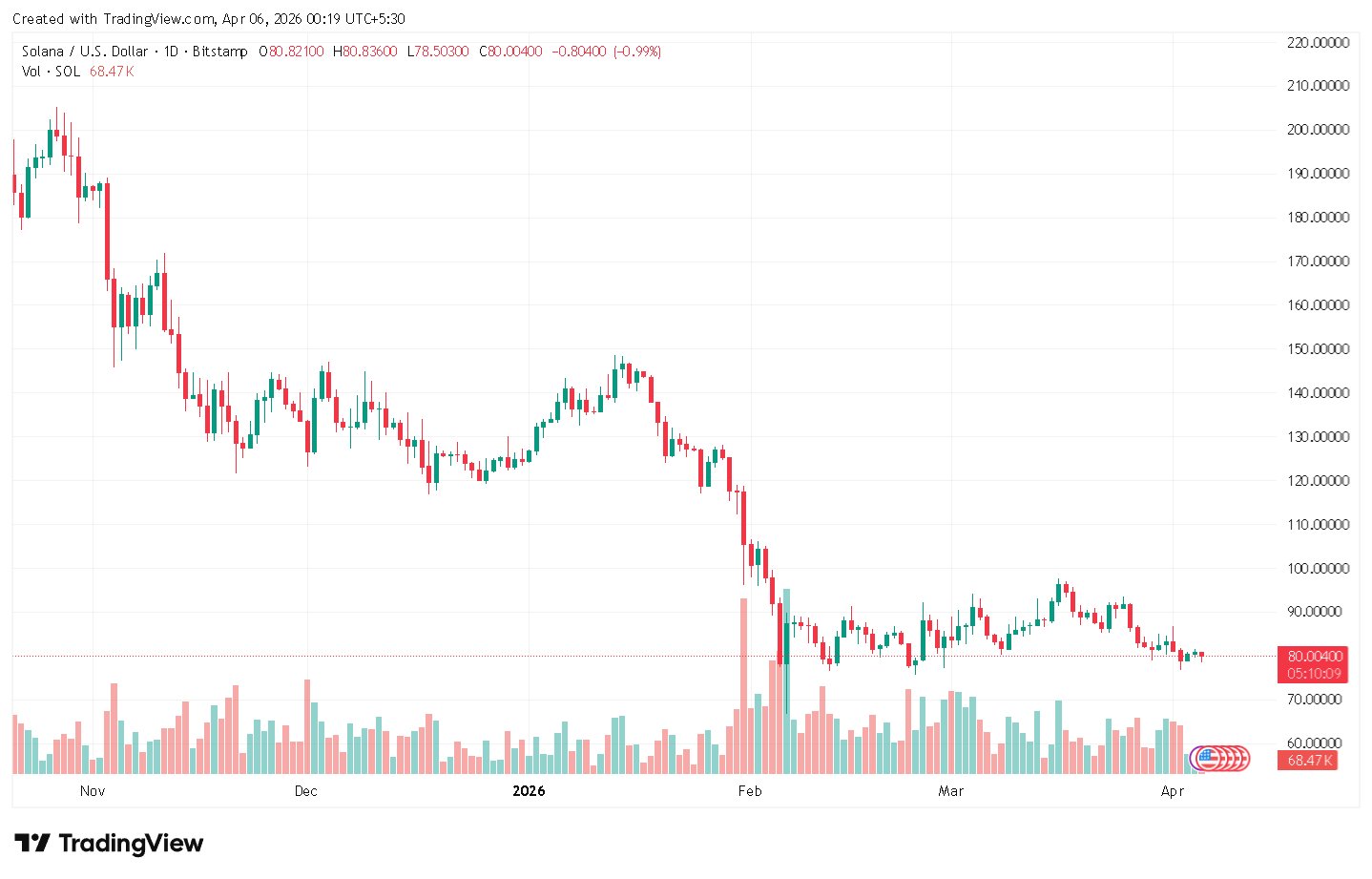 今日Solana的实时价格为$ 79.97 (SOL/USD), 当前市值为 $ 45.78B USD。 24小时的成交量为 $ 7.46M USD。 过去24小时内涨跌幅为 -1.25%, 流通量为 572.50M SOL。