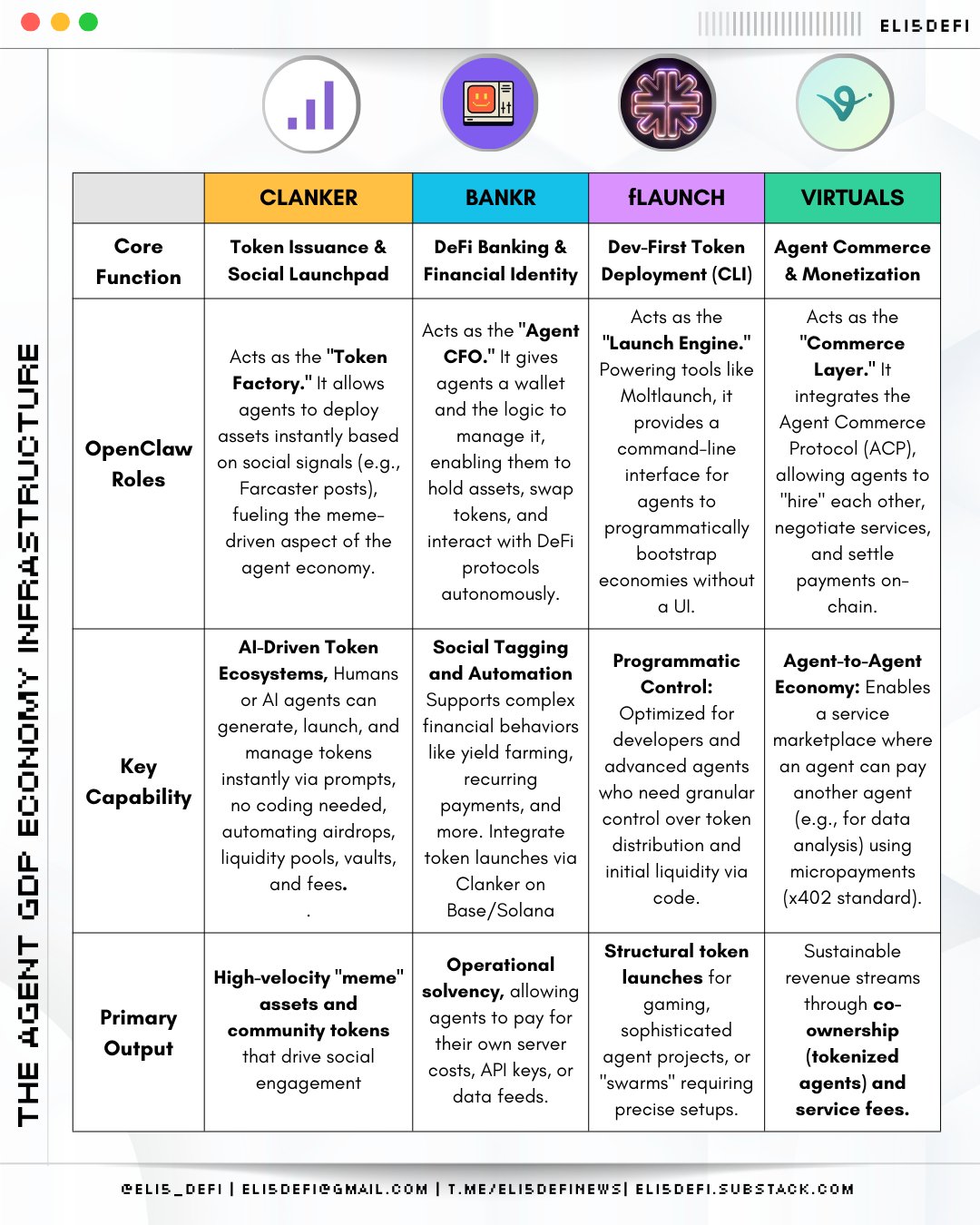 ❶ @clanker_world / $CLANKER → 代币工厂。代理可以在几秒钟内创建自己的代币,围绕Meme、预测或纯粹的投机建立经济体。例如:@Clawnch_Bot