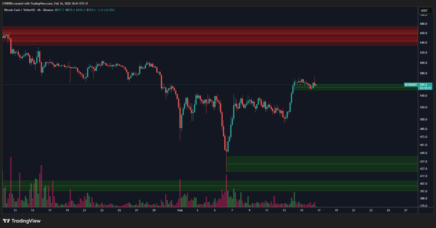 6 4 68 閱讀原文 >釋出後BCH走勢看漲BCH has rebounded well from the support level, and if it holds the support it could rise to the resistance zone.